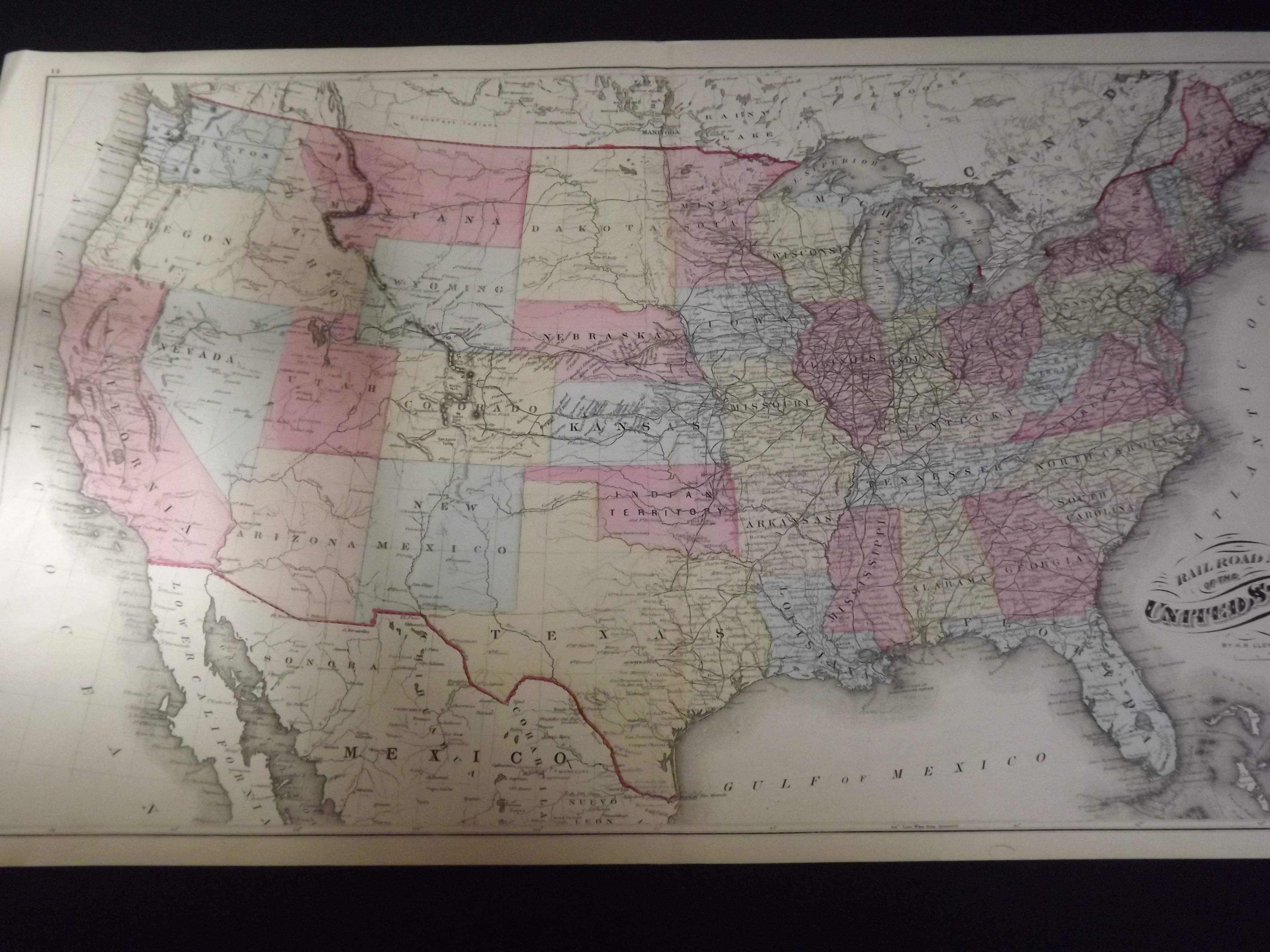 Colored map, 17" x 28", 3/4" top and bottom margins, one inch margins on sides. Slight toning, map of North America on reverse of half the map, but not affecting image; otherwise very good. Attractive bright and clean railroad map of the United States, by the short lived H.H. Lloyd publishing company. The map illustrates the Indian Territory in the Northern part of Texas, just below Kansas and Nebraska.