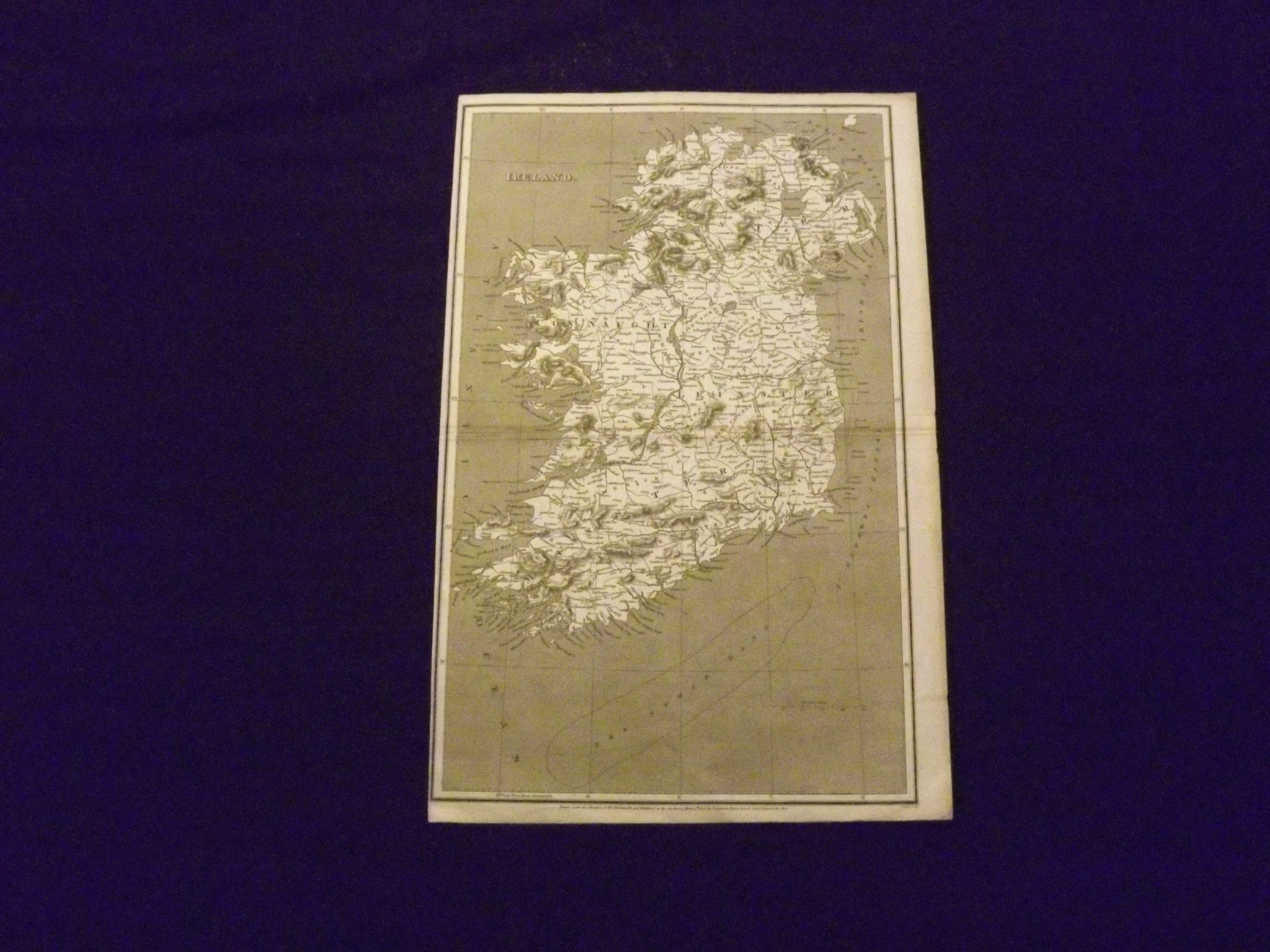 Engraved black and white map, 10" x 16". Center fold, left margin almost at border, slight toning and aging; otherwise very good. Detailed black and white map of Ireland, illustrating the counties and important topographical features.