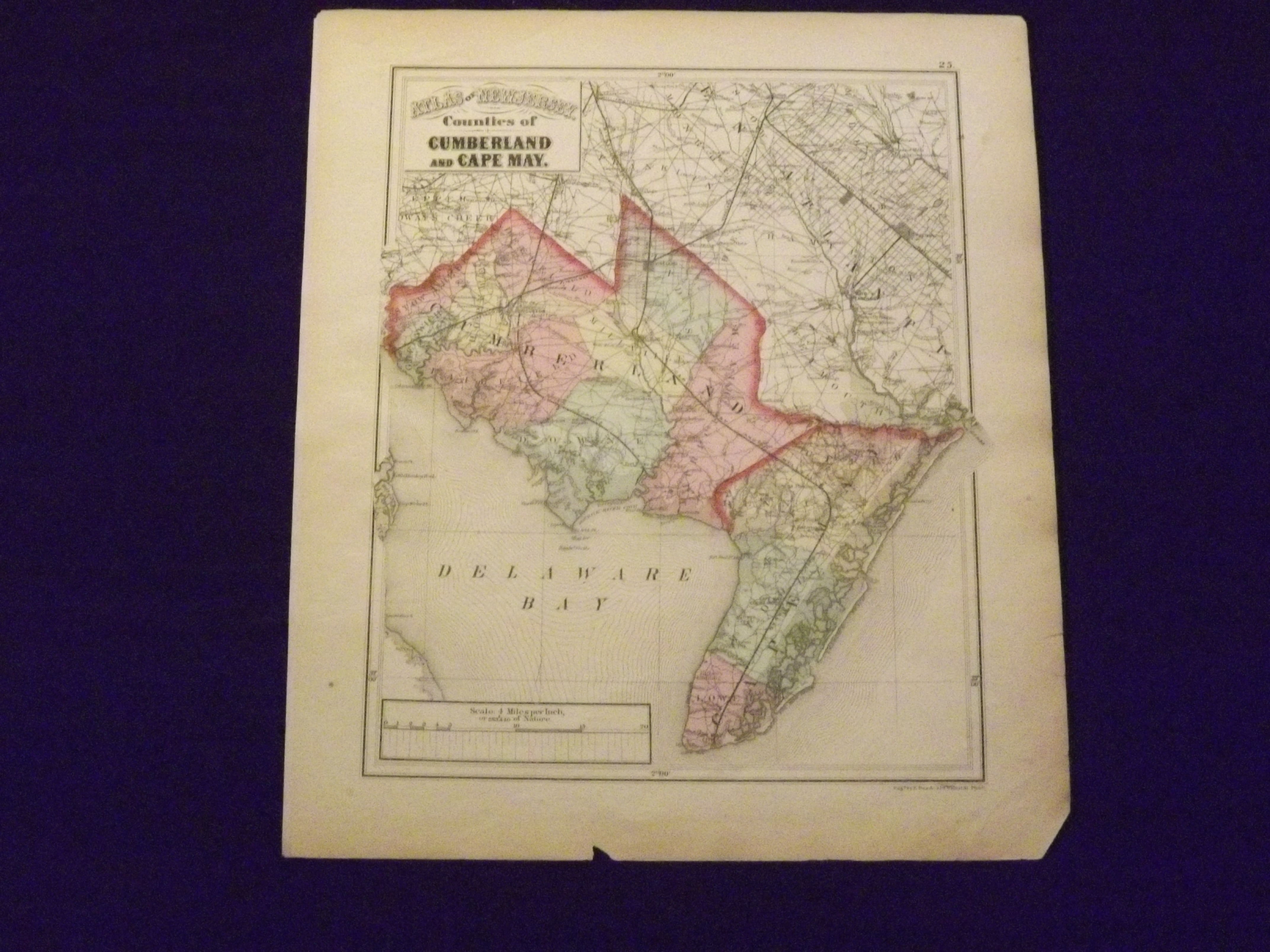 Colored map, ample margins, 14" x 15 1/2". Slight browning, and toning, a couple of minor margin and corner chips and tears, otherwise bright and clean, and in very good condition. This map is from Hopkins' Atlas of New Jersey published in 1873. A very attractive map made with soft pastel colors, featuring part of the Jersey Coast. Engraved by E. Busch.