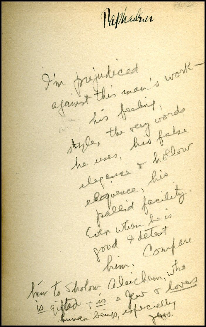 New York: The Macmillan Company, 1923. Hardcover. Very Good. Later printing (first published in 1907). Some modest edgewear, a short tear on one page, a small crack in the paper over the front hinge, a nice, very good copy without dustwrapper. Samson Raphaelson's copy with his ownership signature: "Raphaelson," and his penciled note on the front fly about his fellow-Jewish author: "I'm prejudiced against this man's work – his feeling, style, the very words he uses, his false elegance & hollow eloquence, his pallid facility. Even when he is good I detest him. Compare him to Sholem Aleichem, who IS gifted & IS a Jew & LOVES human beings, especially Jews." He has also made a couple of pencil notes in the text, much of the order of the one on page 35: "Mr. Z., you're a worm." Raphaelson was a successful playwright, best-known for his play *The Jazz Singer.* Zangwill, the London-born son of Russian Jewish refugees, was a popular novelist of his day and the author of *Children of the Ghetto: A Study of a Peculiar People*, which awoke England to the plight of Jewish refugees and helped derail the then current anti-alien legislation. A fascinating association.