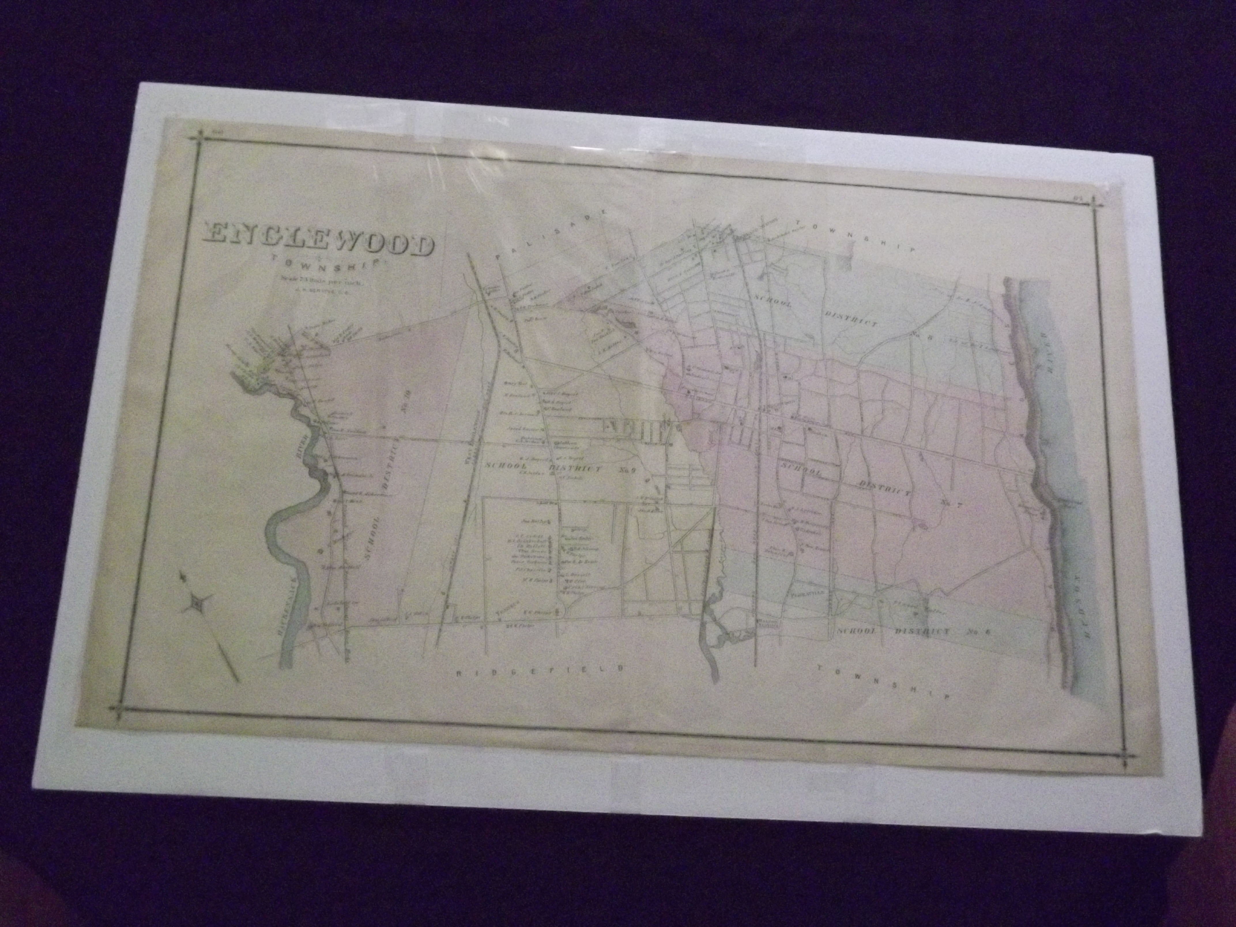 Large (27" x 16 1/2") lightly colored map, map title on map, no date or publication location listed on the map, about half inch margins, center fold. Slight browning and aging, engraved illustrations on reverse; impression is bright and clean. Overall very good plus. This is a rather scarce map from a scarce atlas (Atlas of Bergen County New Jersey 1776-1876). It was published during the American Centennial, and illustrates the different school districts and some estates in Englewood. Map shows the Hackensack and Hudson Rivers bordering the town. Will require extra postage.