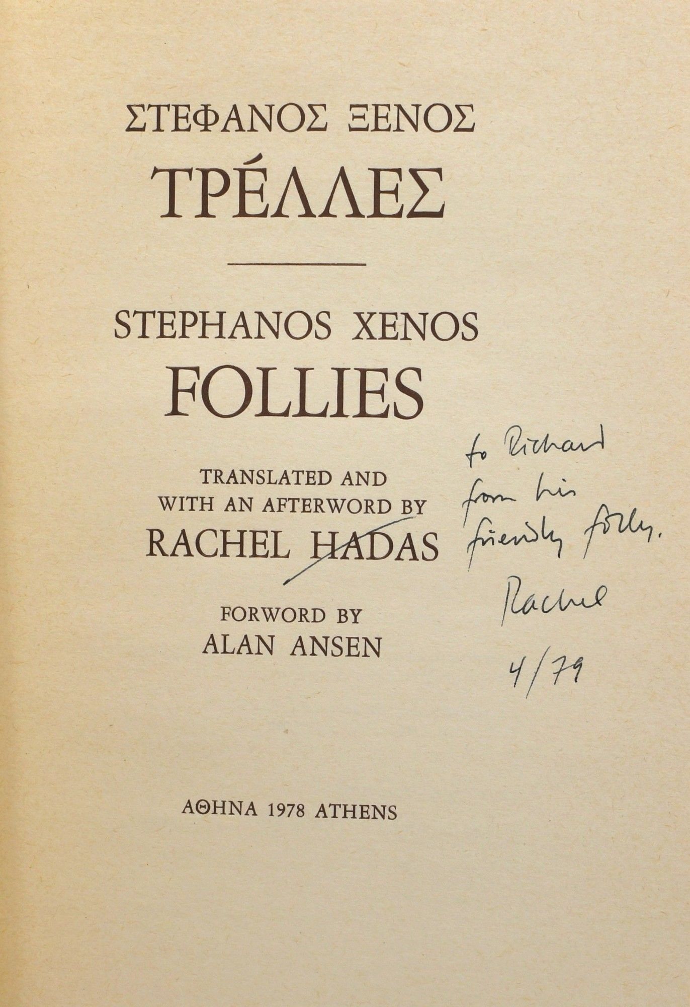 Athens: Aohna, 1978. Soft Cover. Very Good binding/Very Good dust jacket. Signed & Personally Inscribed by Hadas on title page. Binding sound. Dust jacket shows light soiling and edgewear to extremities. No markings in text. Dust jacket protected in a new mylar cover. Very Good binding / Very Good dust jacket.