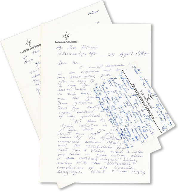 New York: Grove Press, 1984. First Edition. Octavo. Cloth boards; dustjacket; 157pp. Fine copy in bright, unclipped dustwrapper with a few tiny spots of rubbing at extremities, Near Fine. Inscribed by translator Nicomedes Suarez Arauz to playwright Don Petersen, with two lengthy holograph letters from Arauz to Petersen laid in, thanking him for his role in the publication of the book. The cloth edition is scarce.