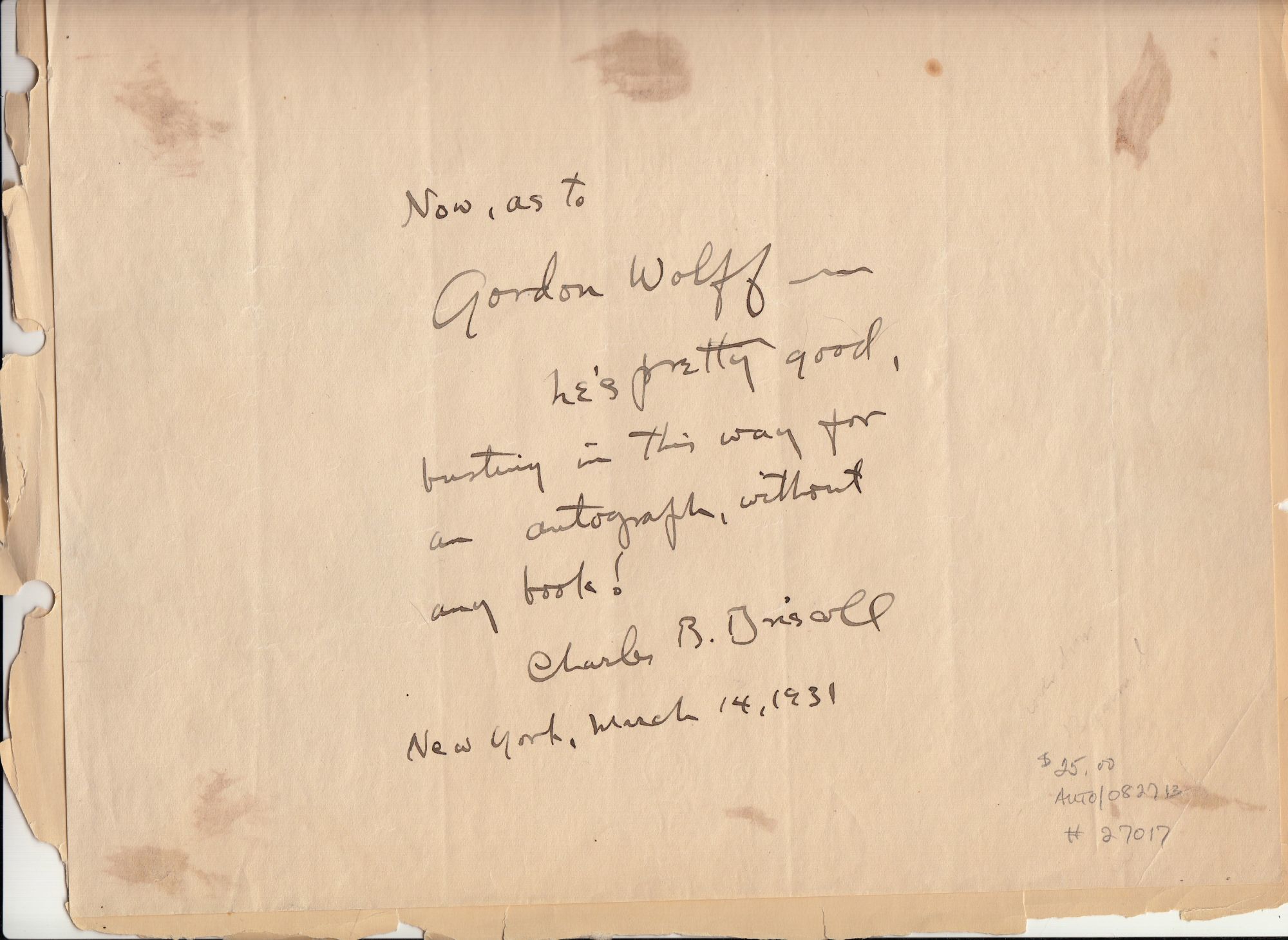 1931. Very Good. Charles B. Driscoll (1885-1951) was a Kansas born American journalist and editor. In this rather droll inscription he writes: "Now, as to Gordon Wolff - he's pretty good, busting in this way for an autograph, without any book! Charles B. Driscoll New York, March 14, 1931." Scrawled on blank sheet affixed to a frayed perforated sheet. Glue remnants not affecting inscription. Very good. AUTO/082713.
