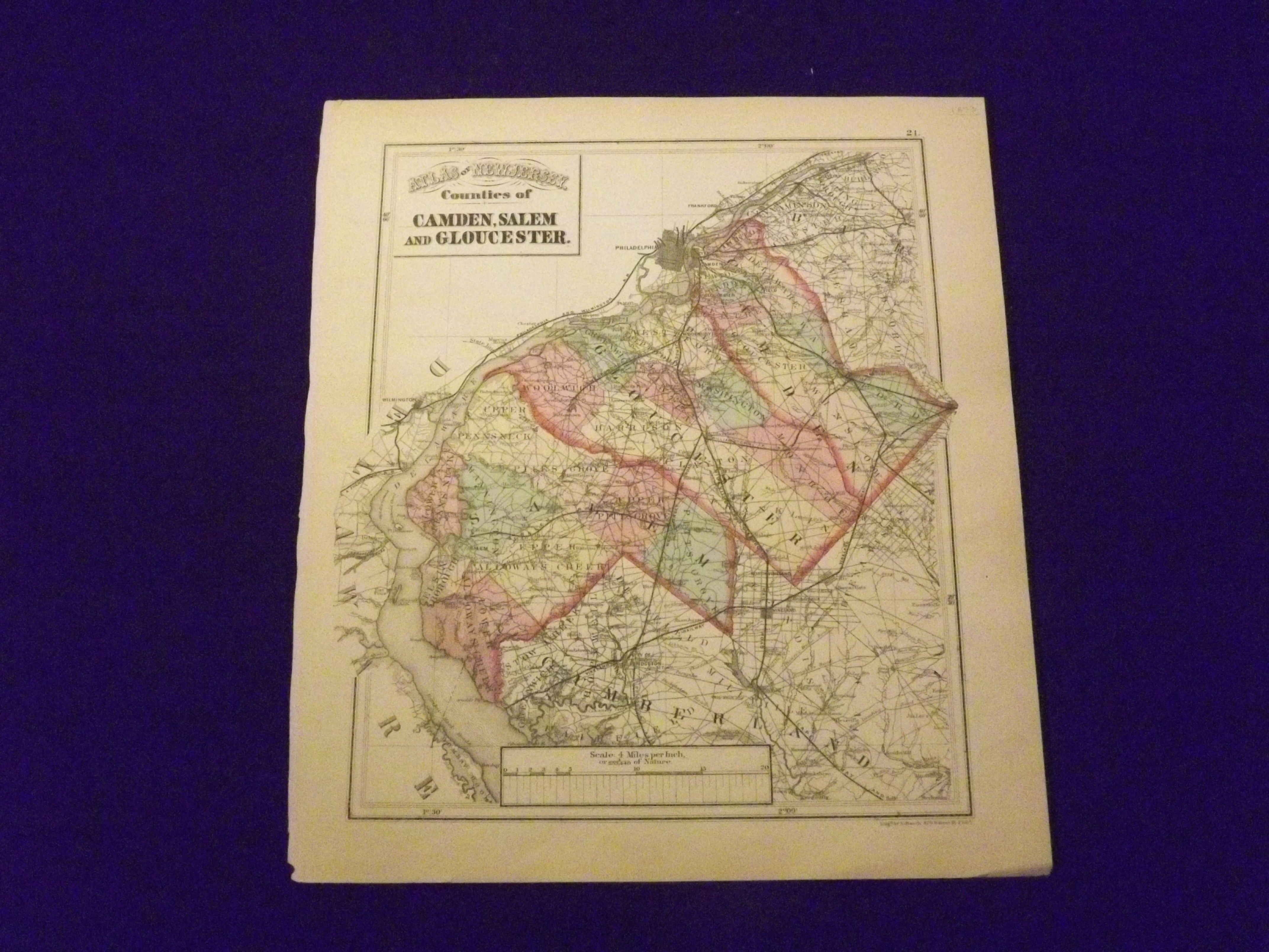 Colored map, ample margins, 13" x 16". Colored map, ample margins, 13" x 16". Some browning, toning, and aging, a couple of small margin chips or tears; otherwise bright and clean, and in very good condition. This map is from Hopkins' Atlas of New Jersey published in 1873. A very attractive map made with soft pastel colors, featuring the Southern New Jersey counties of Camden, Salem and Gloucester. Engraved by E. Busch.