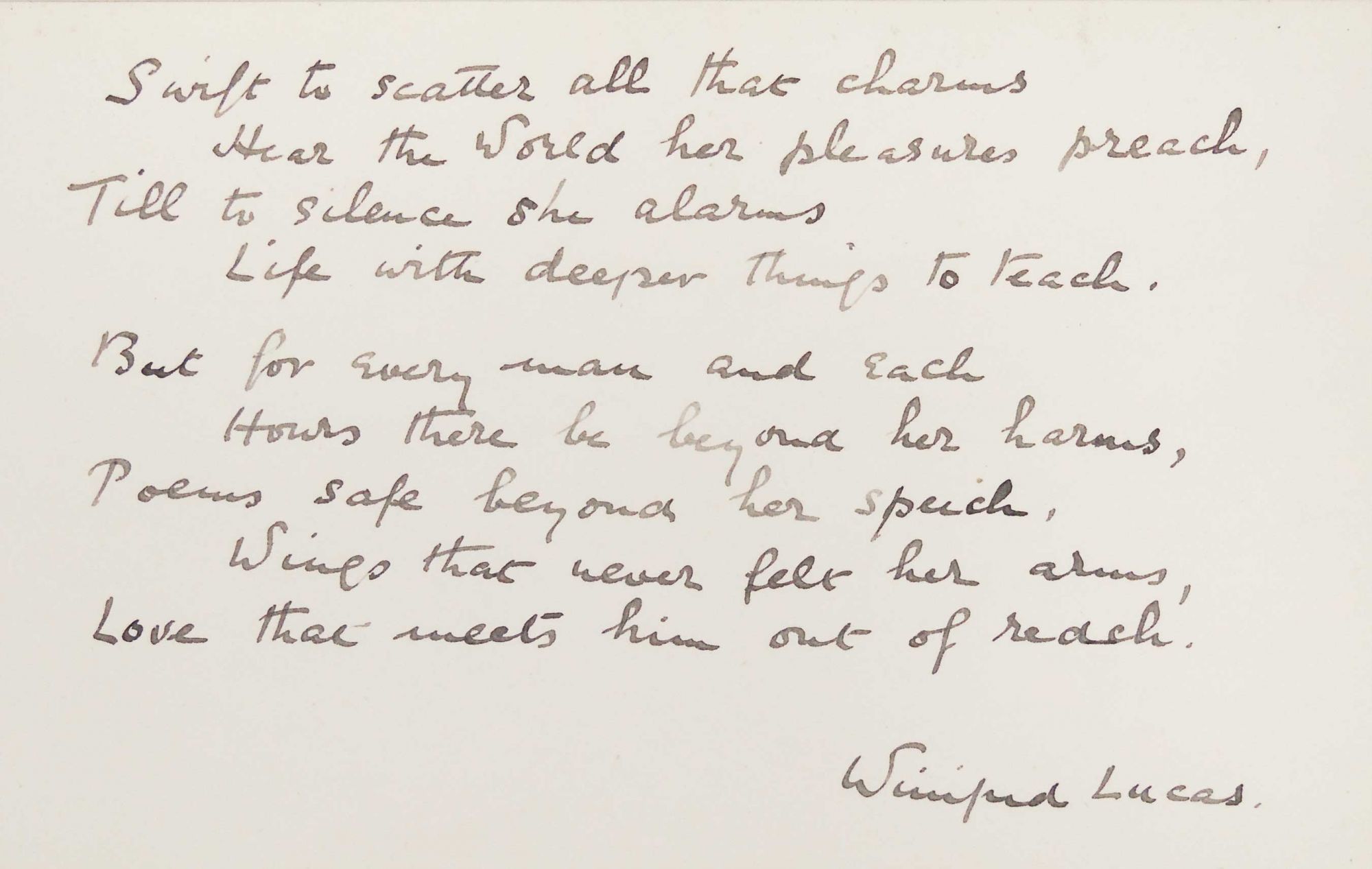 London: Burns & Oates, 1919. Hardcover. Very Good. Hardcover. Scarce first edition of an anthology of verse by Lucas. 12mo. Bound in brown linen with title, author and ornament in gilt to front cover. Slight bumping and fading but very good. Interior pages also very good, with gift inscription on ffep and an annotation in red ink on page 17 noting that a line of verse could be a motto for a sundial. 34 pages plus 4 pages of praise of the writings of Lucas and Alice Meynell. Accompanied by five short ALs from Lucas. Four were written between June - December1904 to Mr. Shorter asking for information and also inquiring about the possibility of submitting verse to "The Sphere." This would be Clement Shorter, the journalist and author who founded "The Sphere" and later "The Tatler." The fifth was to a friend in 1922 to congratulate her on the birth of her baby. Collection also includes fair copies of a few of her poems. POE/090613.