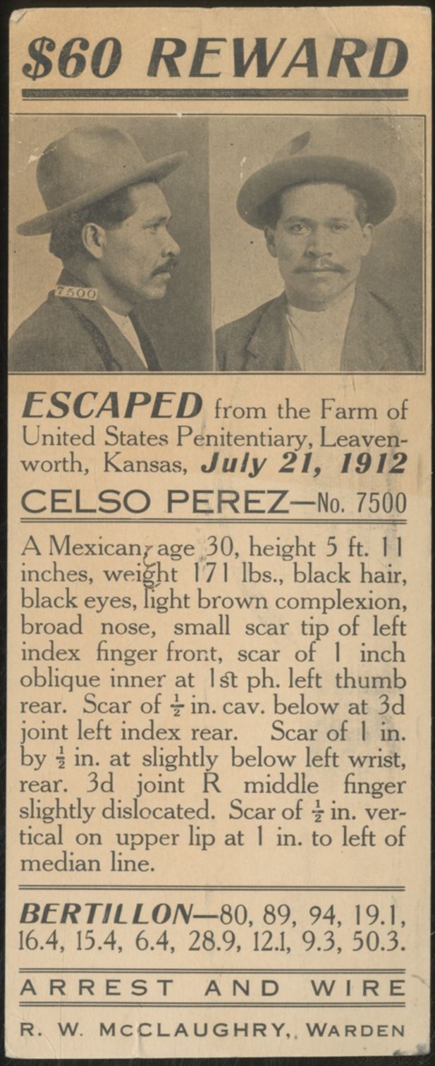Wanted Poster for Celso Perez, Escapee from the Farm of U.S. Penitentiary, Leavenworth, Kansas, July 21, 1912