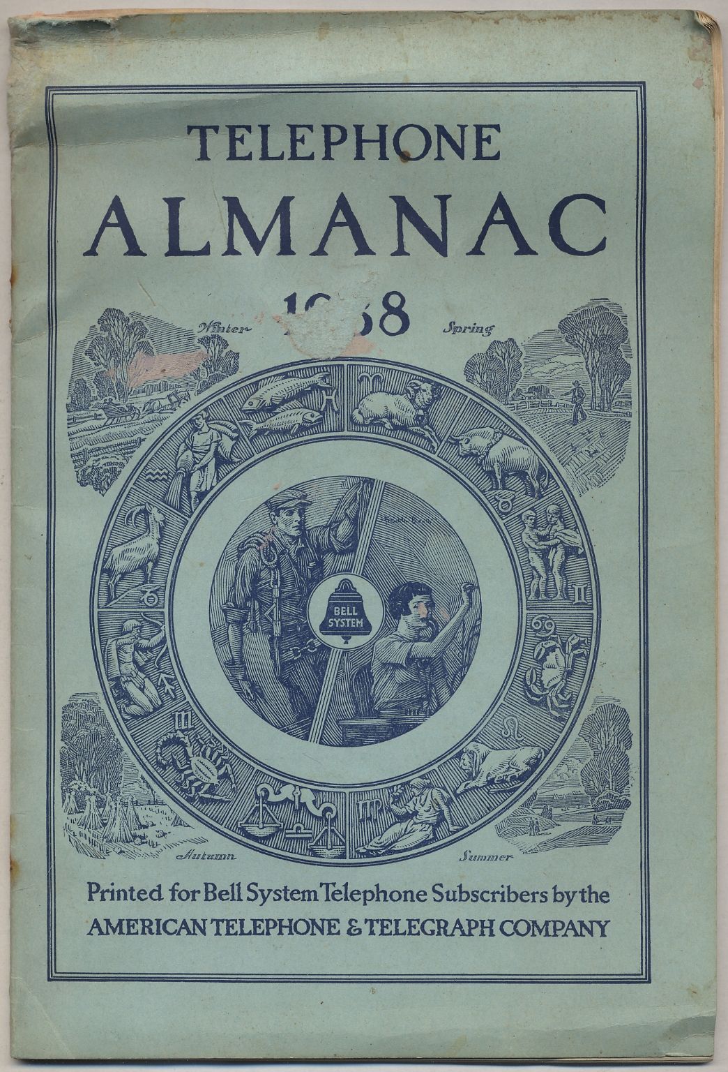 New York: American Telephone & Telegraph Company, 1938. Softcover. Good. First edition. 10" x 7". [32pp] + wrappers. Stapled wrappers. Illustrated. Some staining at the top of wraps, a one inch tear at the head of the spine affecting all pages throughout, rusted staples, scrape on front wrap affecting the printed date, a good only copy. Almanac interspersed with American Telephone news of interest to consumers.