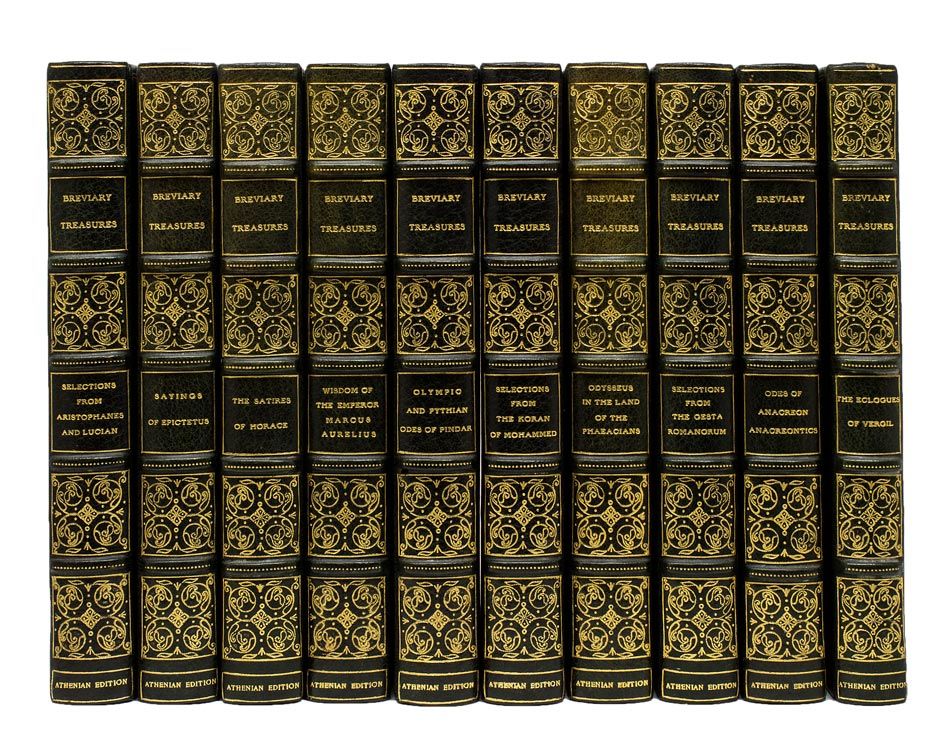 Boston: Privately Printed by Nathan Haskell Dole, 1905. The Athenian Edition, Number 78 of 100 copies on Royal Japanese vellum. Illustrated with frontispieces and head and tail-pieces. 10 vols. 8vo. Bound in full dark blue french levant, gilt spines, t.e.g. Fine. Bookplate of C.W.C. Deering. The Athenian Edition, Number 78 of 100 copies on Royal Japanese vellum. Illustrated with frontispieces and head and tail-pieces. 10 vols. 8vo. A choice set of this finely printed compendium of world literature: