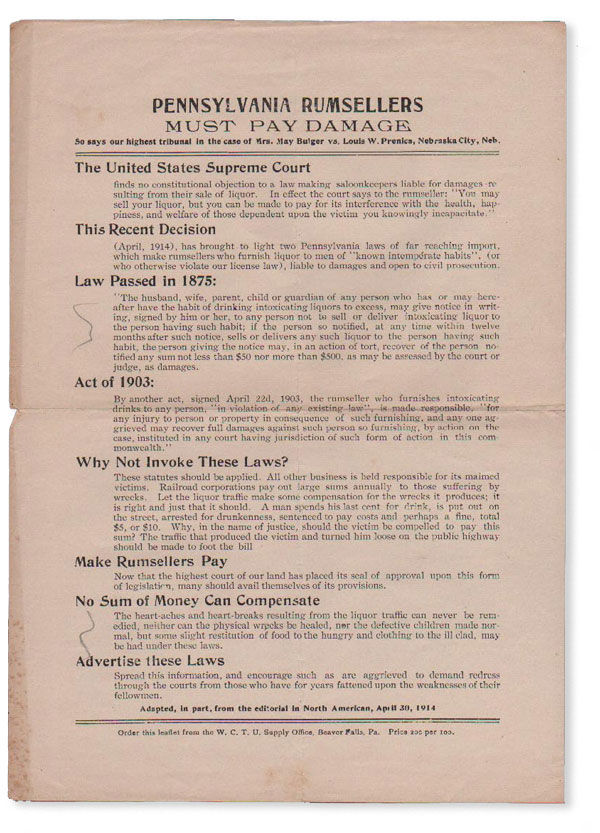 Beaver Falls, PA: WCTU, 1914. First Edition. Broadside circular, 11" x 8" (ca 28cm x 20cm). Text in one column below headline, printed recto-only. Old folds; minor toning and edgewear; two brief pencil marks in left margin; Very Good. Cites recent Supreme Court ruling "finding no constitutional objection to a law making saloonkeepers liable for damages resulting from their sale of liquor;" calls on Pennsylvania citizens to "...Spread this informaion, and encourage such as are aggrieved to demand redress through the courts from those who have for years fattened upon the weaknesses of their fellowmen." At foot of text: "Adapted, in part, from the editorial in North American, April 30, 1914."