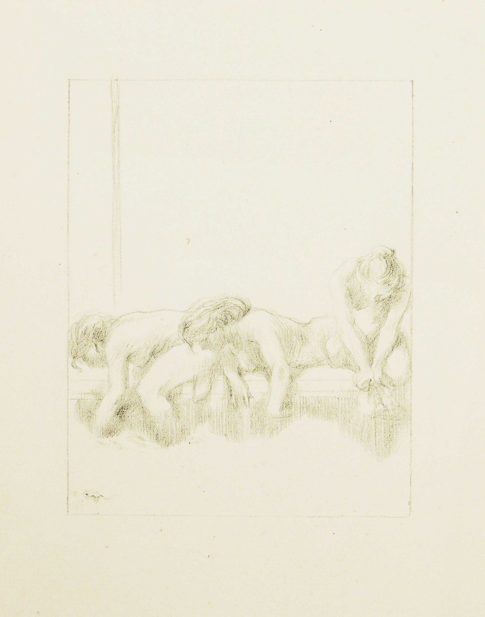 n.p., 1894. Very Good. A lovely lithograph printed in green ink by Charles Hazelwood Shannon. It is an image of three bending nude female figures and appeared in #2 of "The Dial." Shannon and Ricketts were artistic and personal partners for more than fifty years. They designed and illustrated books, founded "The Dial" magazine and Vale Press, and were key figures in the London cultural world. The 4 x 5.5 inch print is on a sheet of 11 x 14 inch paper. There are a few small creases and light brown spots along the paper margins, not affecting the illustration. Said to be from the collections of T. Sturge Moore and his daughter Henrietta but there is no evidence of provenance. Very good condition. ORIG/092413.