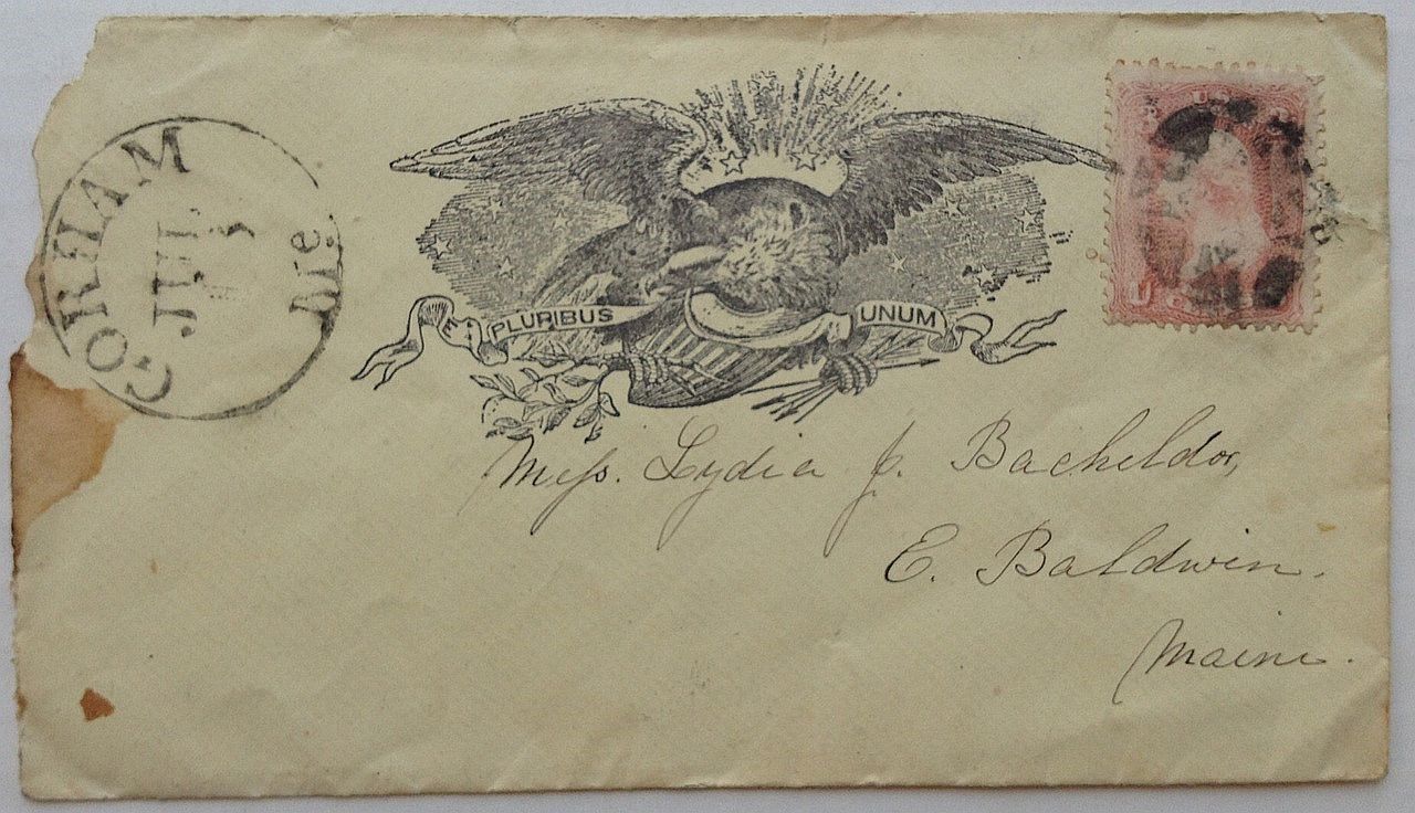 Gorham, Maine, 1864. unbound. Union patriotic cover with a large imprint of an angry Heraldic Eagle with stars & stripes shield, holding arrows in one talon and an olive branch in the other, draped with a banner marked "E. Pluribus Unum." Postmarked: "Gorham, Maine, July 13" with a cancelled 3c Washington (A-25) stamp, pink variety. No year, circa 1864, 3 x 5.5 inches. Small quarter-inch stain on the irregularly cut left margin, not affecting postmark. Good condition.