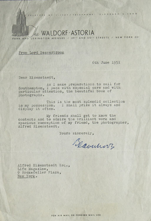 Typed Letter, Signed (“Beaverbrook”), to Alfred Eisenstaedt, acknowledging a “beautiful book of photographs”