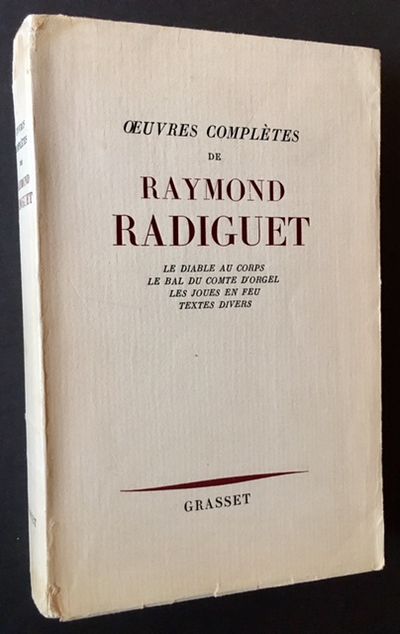 Paris: Bernard Grasset, 1952. Original Wraps. Collectible; Very Good. 1952 compilation of the complete writings of Raymond Radiguet, including "Le Diable au Corps", "Le Bal du Comte D'Orgel", "Les Joues en Feu" and "Textes Divers". Clean and VG (with light wear at the spine ends) in its beige wrappers. Thick octavo, 490 pgs., deckled fore and botom edges. Text in French.