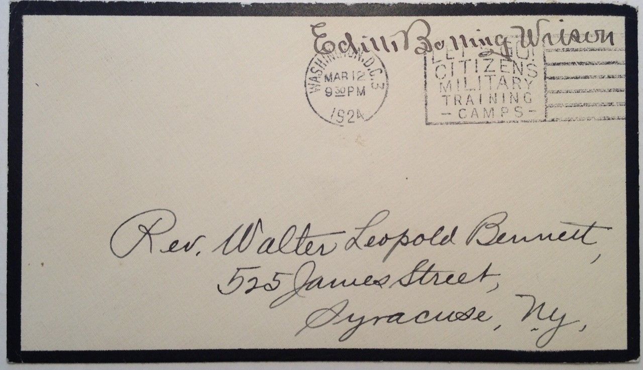 Washington, D.C., 1924. unbound. 3.5 x 6 inches, written on a mourning cover to New York, postmarked "Washington D.C. March 12, 1924" with a slogan for Citizens Military Training Camps. Signed only one month after President Wilson's death. Gently edge-worn; very good condition.