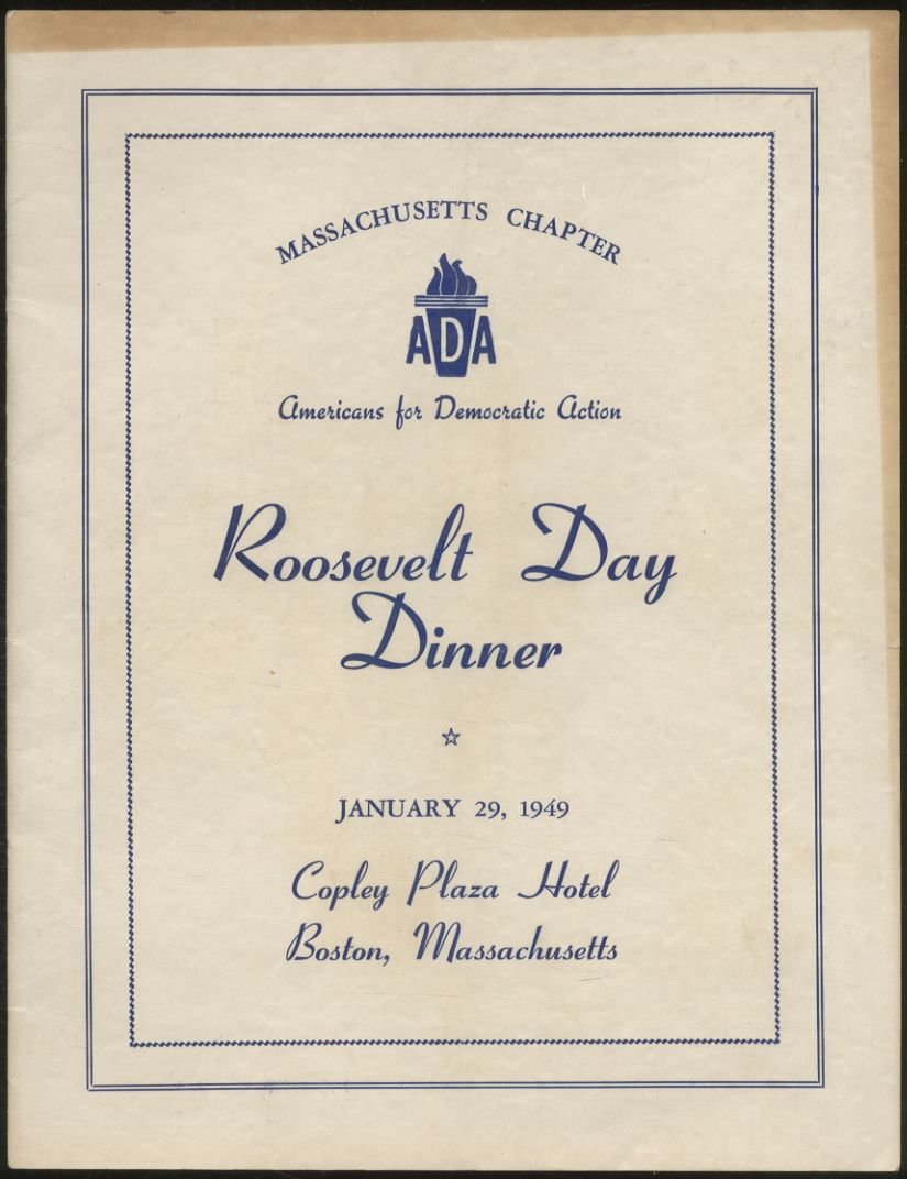 Boston, Massachusetts: Massachusetts Chapter of Americans for Deocratic Action, 1949. Softcover. Near Fine. Roosevelt Day edition. Stapled wrappers. Toning on the page edges and slight creasing else near fine. Massachusetts Chapter of Americans for Democratic Action Roosevelt Day Dinner January 29, 1949 at the Copley Plaza Hotel Boston, Massachusetts.