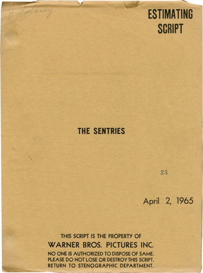 Tan titled wrappers, noted as ESTIMATING on the front wrapper, rubber-stamped copy No. 23, dated April 2, 1965. Distribution page present, with receipt intact. Title page present, dated 4/1/65, with credits for screenwriter Dozier. 136 leaves, mimeograph on yellow stock. Pages about Fine, wrapper Very Good plus bound internally with two gold brads.
