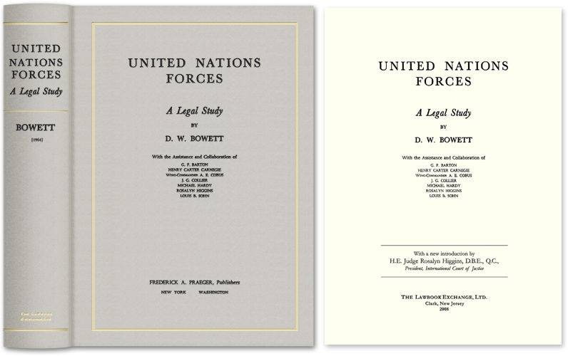 2008. ISBN-13: 9781584777151 ISBN-10: 158477715X. Comprehensive Discussion of the Use of U.N. Forces Bowett, D.W. United Nations Forces: A Legal Study of United Nations Practice. Foreword by Lord McNair, QC. Originally published: New York: Frederick A. Praeger, [1964]. xiii (vii-x new Foreword, xi-xiii new preface), xxiv, 579 pp. Reprinted 2008 by The Lawbook Exchange, Ltd. With a new preface by H.E. Judge Rosalyn Higgins, President, International Court of Justice. ISBN-13: 9781584777151. ISBN-10: 158477715X. Hardcover. New. $49.95 * A title in the Foundations of the Laws of War series, Joseph Perkovich, General Editor. Bowett's pathbreaking treatise offers a comprehensive historical and prescriptive discussion of the use of U.N. forces in the maintenance of international peace and security. The author, Emeritus Whewell Professor of International Law in the University of Cambridge, was assisted in this study by Judge Rosalyn Higgins, current President of the International Court of Justice, J.G. Collier of King's College, London and Professor Louis B. Sohn of Harvard Law School. "This is a most impressive work based on considerable research as well as on the author's first-hand experience in the United Nations, and marked with a rare insight into the problems currently facing the international community.": B.K. Spitz, South African Law Journal 82 (1965) 270.