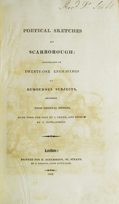 London: Printed for R. Ackermann, 101, Strand, by J.Diggins, Saint Ann's Lane, 1813. First edition. Twenty-one hand-colored engraved plates after J. Green, by Thomas Rowlandson. 215 pp. 1 vols. 8vo. Bound in contemporary boards, with contemporary brown blindstamped calf spine, gilt stamped title and drab boards, uncut. Minor loss to calf at bottom of spine. In full crimson morocco pull off case, by Riviere. Rowlandson, Thomas. First edition. Twenty-one hand-colored engraved plates after J. Green, by Thomas Rowlandson. 215 pp. 1 vols. 8vo. According to the Advertisement, “The originals of the plates…were sketches made as souvenirs of the place during a visit to Scarborough, 1812. They were not intended for publication, but being found to interest many persons of taste, several of whom expressed a desire to possess engravings of them, and some gentlemen having offered to add metrical illustrations to each the present for of publication has been adopted…” The poems are by Combe, Papworth, et. al. This edition contains all the plates of the first, with a Dedication, Contents, and the initials of the authors added. Tooley 423; Abbey Scenery 297
