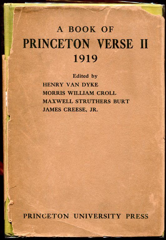 Princeton University Press, 1919. 1st. Cloth. Collectible; Very Good/Good. The 1919 1st appearance in book form by F. Scott Fitzgerald, whose 3 poems ("Marching Streets", "The Pope at Confession" and "My First Love") were --famously-- attributed to "T." Scott Fitzgerald. Solid and VG (with bright gilt-lettering at the front panel and spine) in a clean, G+ example of the fragile dustjacket, with a 1 3/4" loss at the spine crown, light chipping as well at the spine base and panel edges --and an inconspicuous, even split at the front hinge, separating the front panel and front flap fold from the rest of the dj. A piece of plastic covering however nicely masks this and renders the entire jacket quite presentable and attractive. 12mo, 179 pgs.