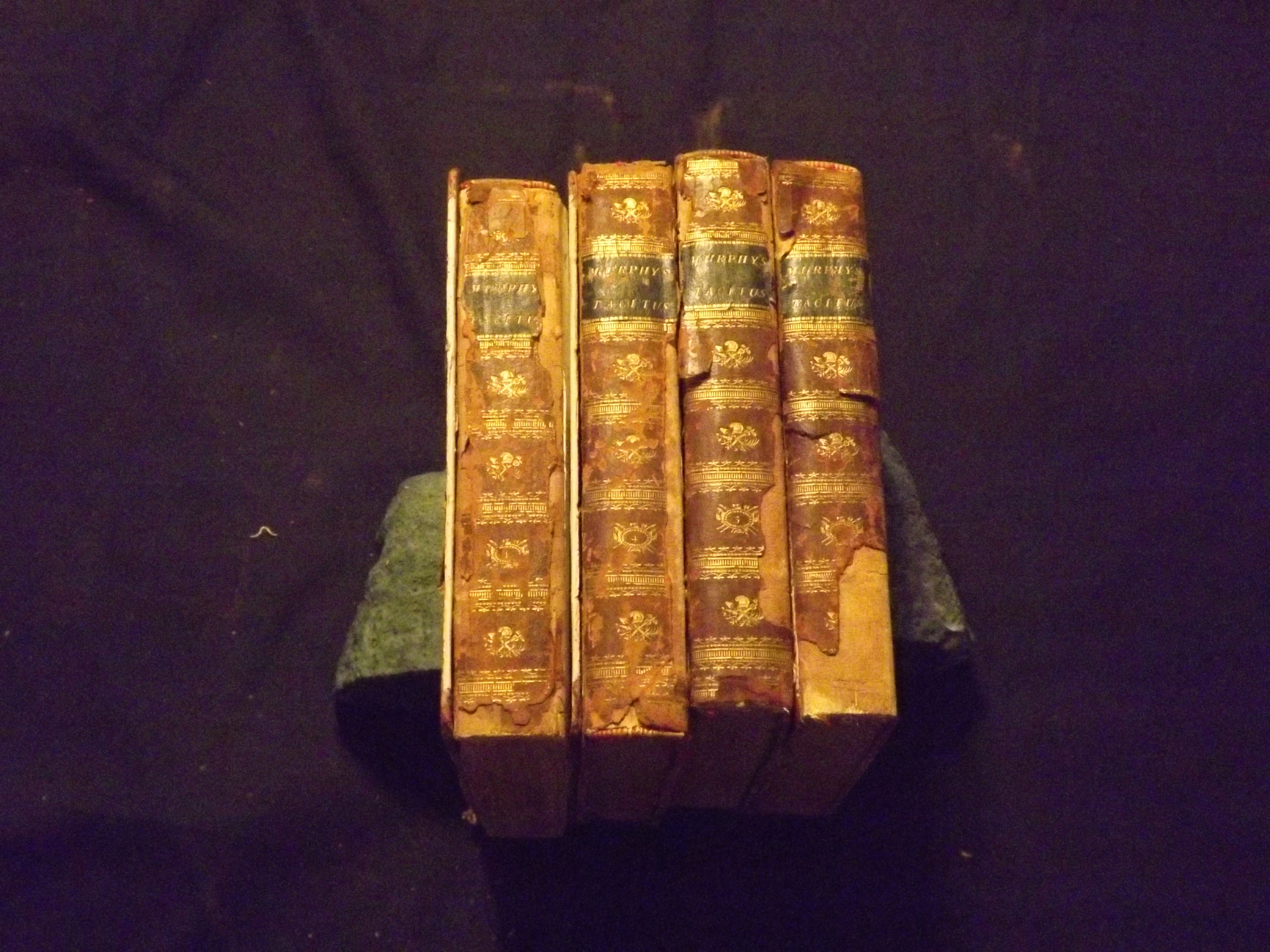 4 Volumes, large 4to, leather spine and corners with boards, spine labels, illustrated with four folding maps. Covers detached or nearly detached, some significant wear to spine and extremities, with some tears and pieces missing from spines, slight aging, occasional foxing, a little soiling and staining. Needs rebinding, but contents are in very good condition. Tacitus (56 AD-120 AD) was a very influential Roman historian born to a wealthy family in Gaul. He became a senator during the reign of Domitian, and was well known for his oratory and debating skills. He was also a prolific writer producing 16 books during his lifetime. This set provides a substantial part of his key writings and the four maps of the Ancient World, Asia, Italy and Germany are present, and in very nice condition. Will require extra postage. unrv bio tacitus website.