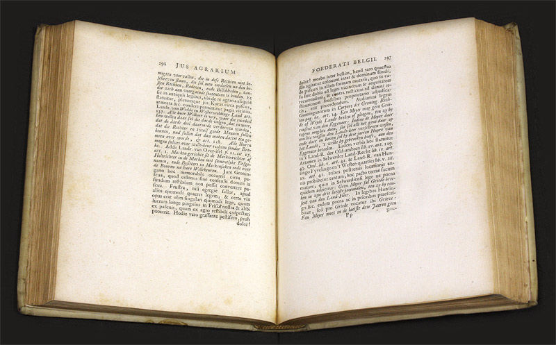 1751. Franeker, 1754. 3 vols.. Franeker, 1754. 3 vols. Learned Study of Roman and Dutch Agricultural Law Trotz, Christian Hen[drik] [1703?-1773]. Jus Agrarium Foederati Belgii. Franeker: n.p., 1751-1754. Three volumes. Printed on wide-margined paper. Quarto (10" x 8"). Contemporary vellum, early hand-lettered titles to spines. Light soiling to boards, somewhat heavier soiling to spines, extremities lightly bumped with minor wear, vellum just beginning to crack through pastedowns of Volumes II and III, recent bookseller (or auction) description pasted to front pastedown of Volume I. Woodcut title page devices, head-pieces, tail-pieces and decorated initials. Later bookplate to front pastedown of Volume I. Some toning, light foxing and browning in places. Stuck-through early owner signatures to front endleaves of Volumes II and III, interiors otherwise clean. $650. * Only edition. Still an important historical work on agricultural law and the law concerning dikes and watercourses, it examines Dutch law in Volumes I and II (1751, 1754). The final volume, which is titled Jus Agrarium Romanum (1753), examines Roman law. This study is based on a series of public debates (disputationes) he sponsored at the University of Freneker, where he was a professor of law. Born in Germany and educated at the universities of Halle, Leipzig, Marburg and Utrecht, Trotz was an important scholar of public and constitutional law. A prolific author, Jus Agrarium is his most important work. OCLC locates 3 copies in North American law libraries (Harvard, UC-Berkeley, Yale). We located another copy at the Library of Congress. Dekkers, Bibliotheca Belgica Juridica 172.
