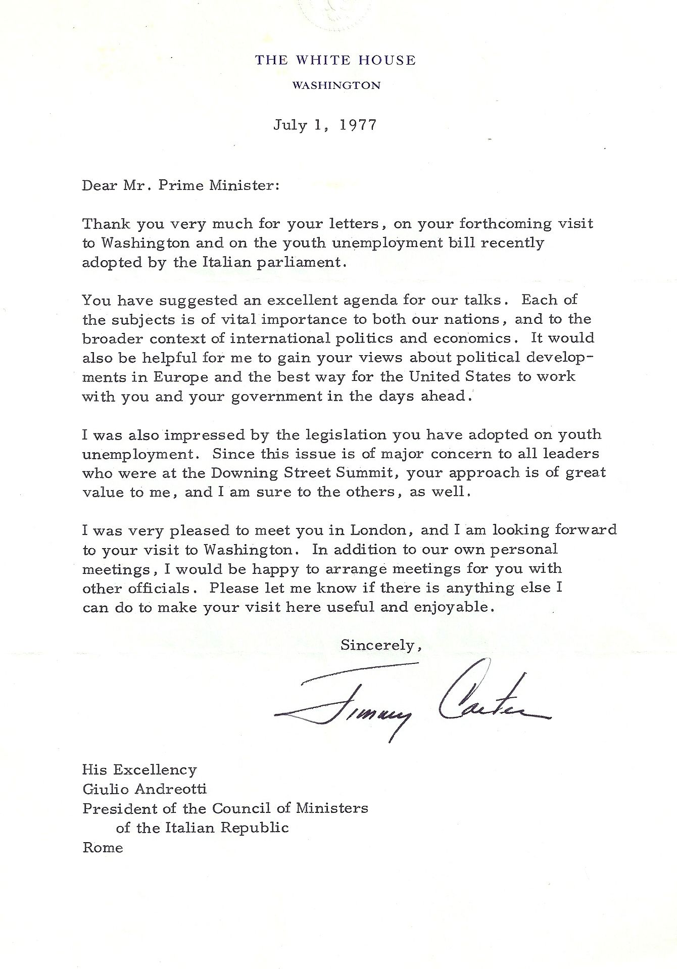 Washington DC, 1 July 1977. Letter. Faint folds from mailing. Fine. Superb letter on White House stationery SIGNED in full to the Prime Minister of Italy, Giulio Andreotti, regarding an upcoming visit to the United States and a youth unemployment bill recently passed by the Italian parliament. In part: "You have suggested an excellent agenda for our talks. Each of the subjects is of vital importance to both our nations, and to the broader context of international politics and economics. It would also be helpful for me to gain your views about political developments in Europe and the best way for the United States to work with you and your government in the days ahead." Letters exchanged between world leaders are, as one would expect, quite scarce in the marketplace.