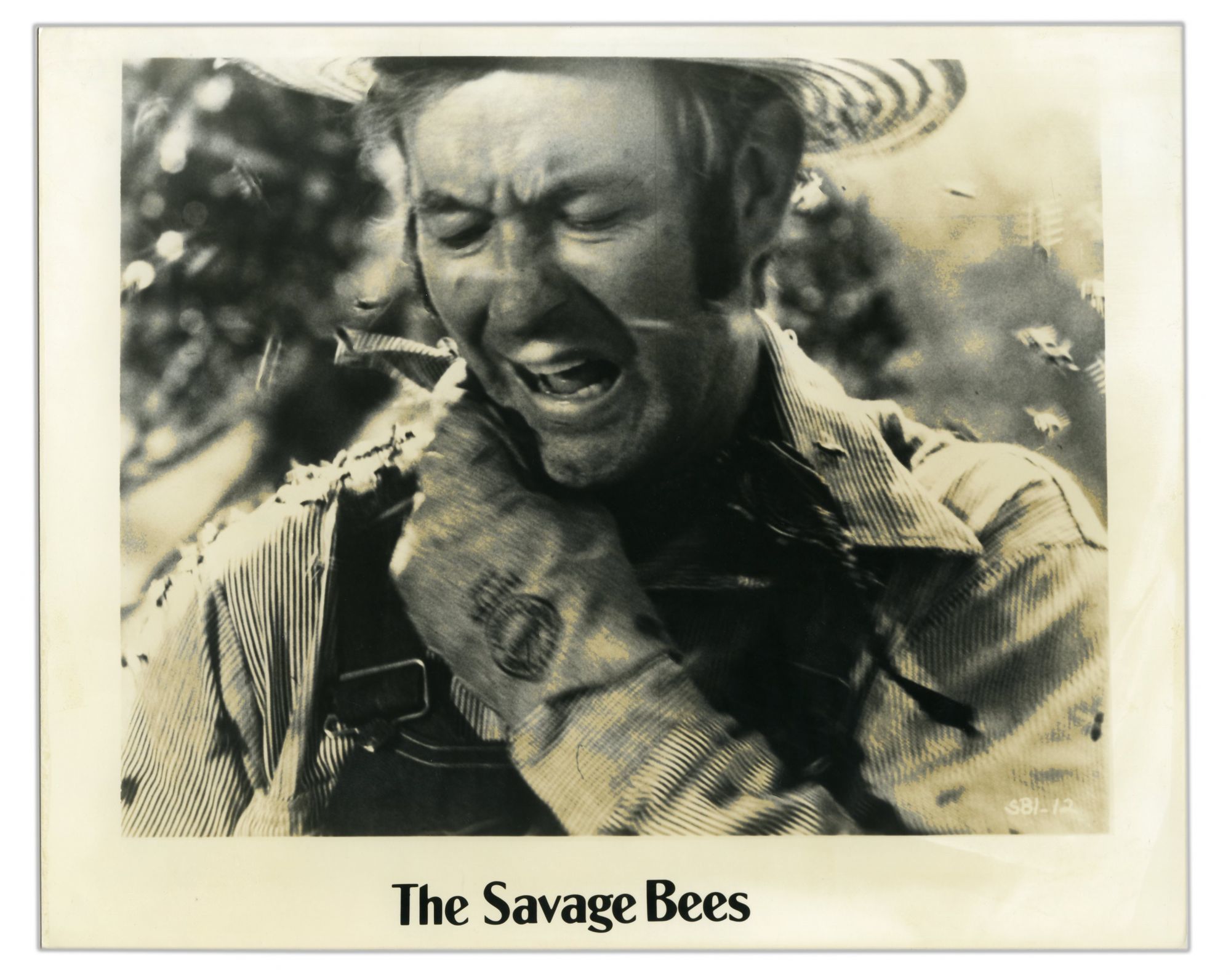 London: National Broadcasting Company [NBC], 1978. Eight vintage black-and-white still photographs from the 1978 release of the 1976 US television film. Mimeograph snipes affixed to the versos, with distributor rubber-stamps and layout annotations.