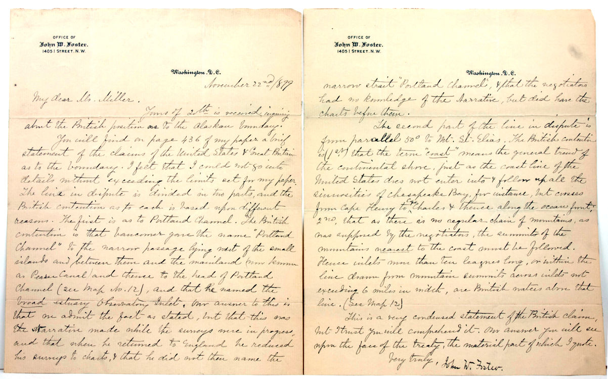 Washington, D.C., 1899. 4 pp. 4to. Old folds, else fine. 4 pp. 4to. The letter traces the diplomatic claims of Great Britain in Alaska and goes into detail about the 2 contested parts, the "Portland Channel" and the parallel 50 degrees to Mt. St. Elias.