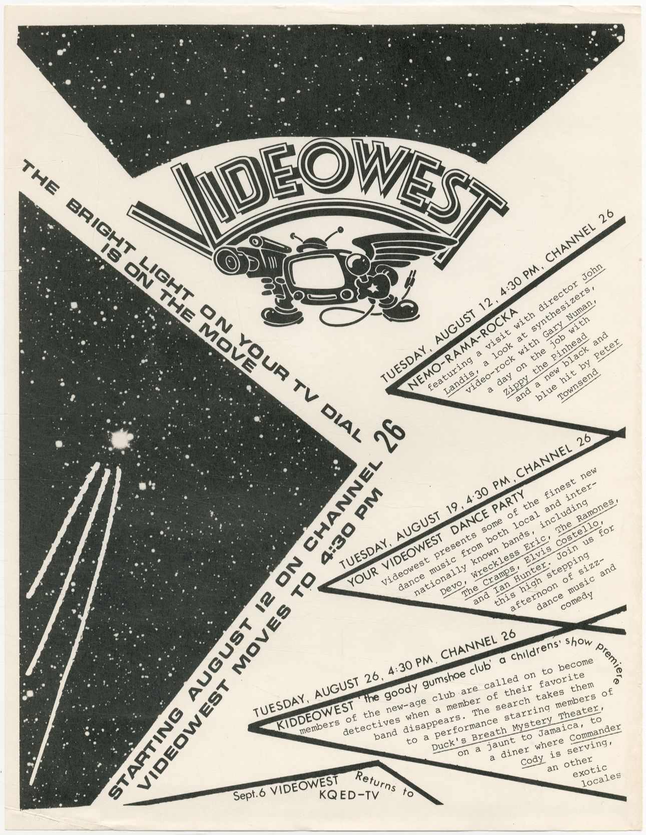 San Francisco, 1980. Unbound. Fine. Photomechanically reproduced flyer on 8.5" x 11" paper. Fine. An original flyer promoting the lineup for the television channel, Videowest including "nemo-Rama Rock," "Your Videowest Dance Party," and "Kiddeowest: The Goody Gumshow Club, a Children's Show Premiere." Videowest was an independent San Francisco studio that started a new genre of music journalism by using a montage of interviews, news, and music videos set to themes such as "politics." They featured many bands between 1978 - 1980 including, Devo, The Clash, The Ramones, REM and U2.