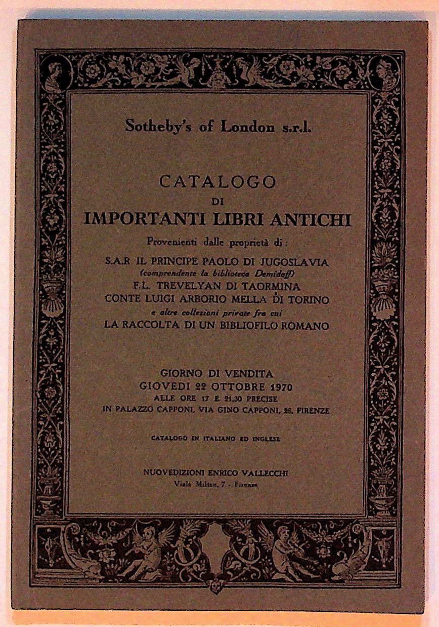 Catalogo di Importanti Libri Antichi. Provenienti dalle proprieta di: S.A.R. il principe Paolo di Jugoslavia (comprendence la biblioteca Demidoff) F.L. Trevelyan di Taormina conte Luigi Arborio Mella di Torino e altre collevioni private fra cui La Raccolta di un Bibliofilo Romano