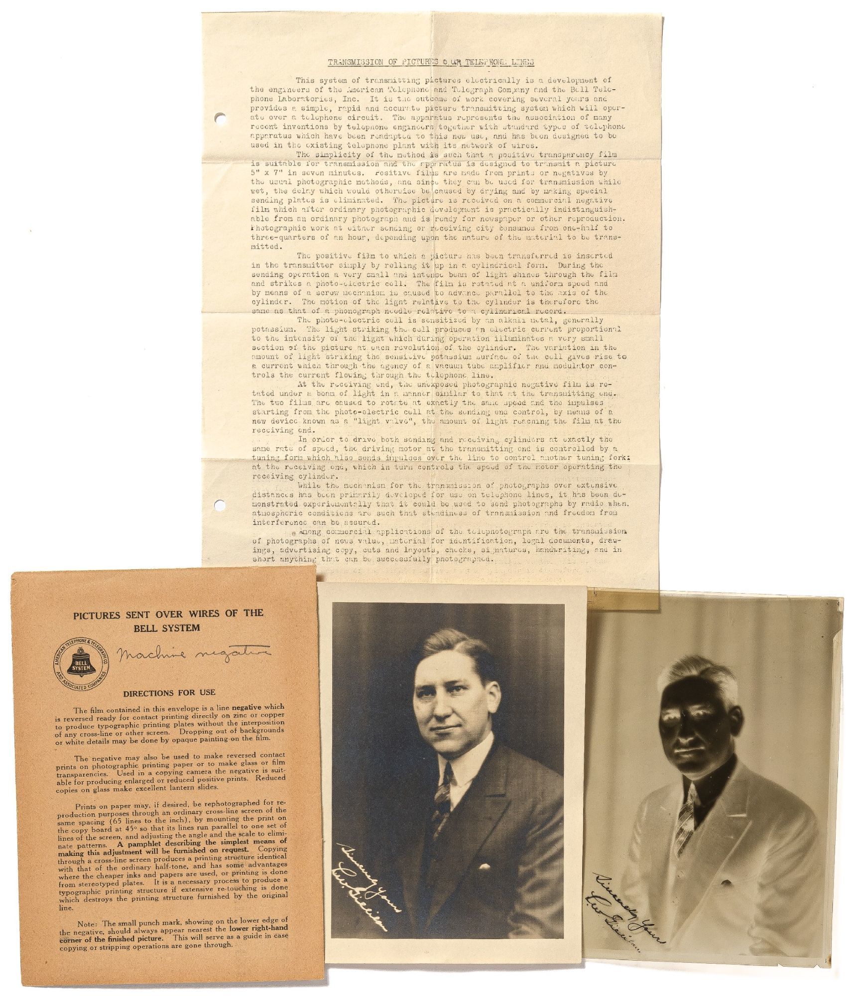 1925. Unbound. Fine. A press kit consisting of: a single photomechanically reproduced sheet printed with two punch holes along the left margin; printed 5.5" x 7.5" envelope; 5" x 7" black and white photograph; and 5" x 7" negative of the same image. Overall near fine with some folds to the sheet from being housed in the envelope; pin holes to the negative and a small nicks on lower edge, all as issued. A promotional mailer issued by Bell Laboratory promoting its newest invention, a system that can send an image over a telephone line through the use of a cylindrical apparatus that produces a negative. Included is a sheet describing the process in detail along with a negative and the photos it created. An example of the leaps in technological advancement taking place in the world of electronic transmission during the 1920. Scarce.