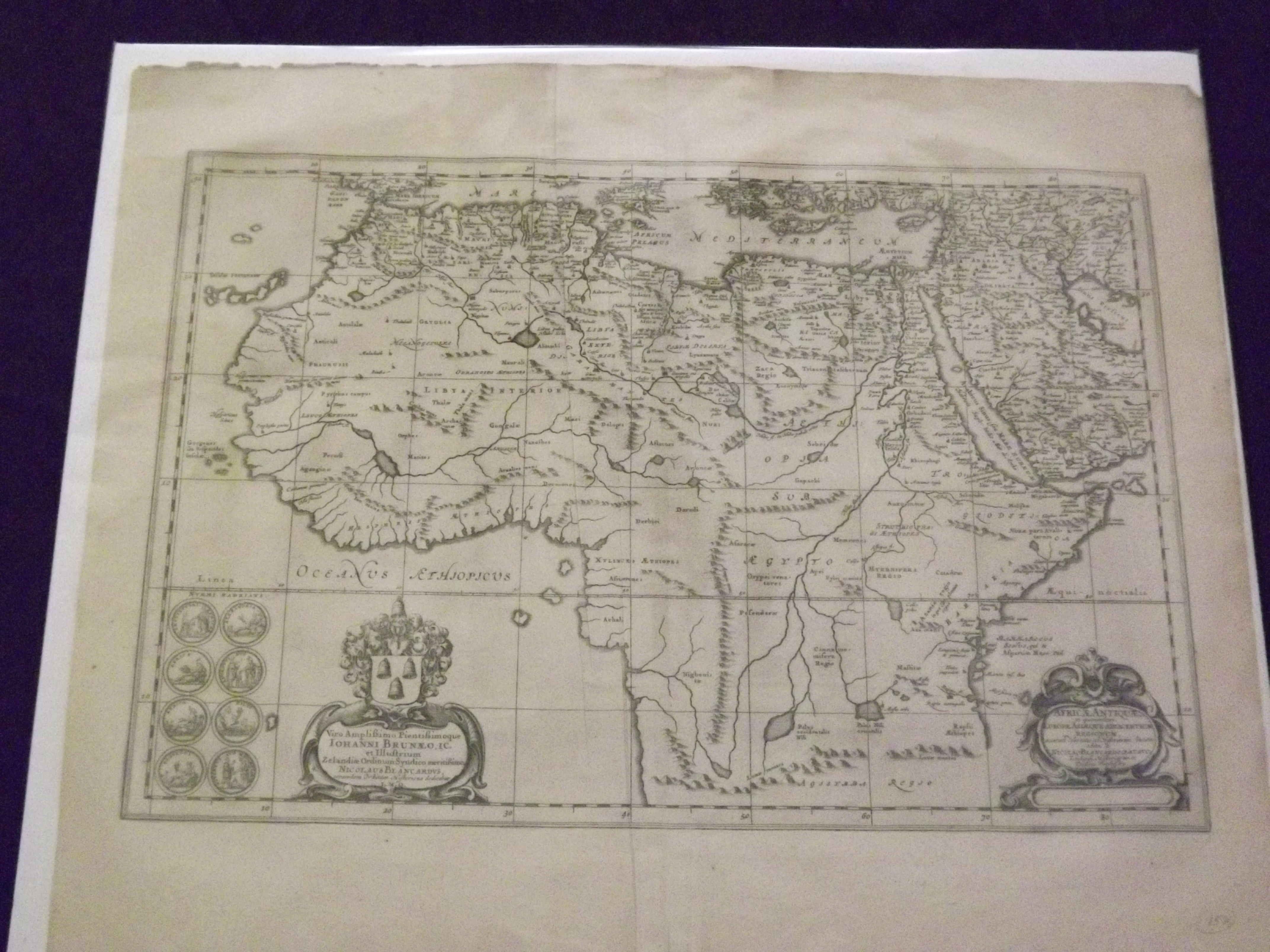 Engraved map, uncolored, 375x530mm (21" x14 1/2"), wide margins, cartouche. Extraneous soft crease in left quadrant, middle crease slightly visible, top edge a little rough, normal aging; otherwise in very good condition. This is a handsome map of northern and central Africa, which presents the source of the Nile coming from lakes Zaire and Zaflin, near the Mountains of the Moon. There are eight Roman seals and two decorative cartouches on the map. The cartouches include Nicholas Blankaart's (1625-1703) name. Blankaart was a professor at Leiden who made maps for Joannes Janisson (1588-1664).