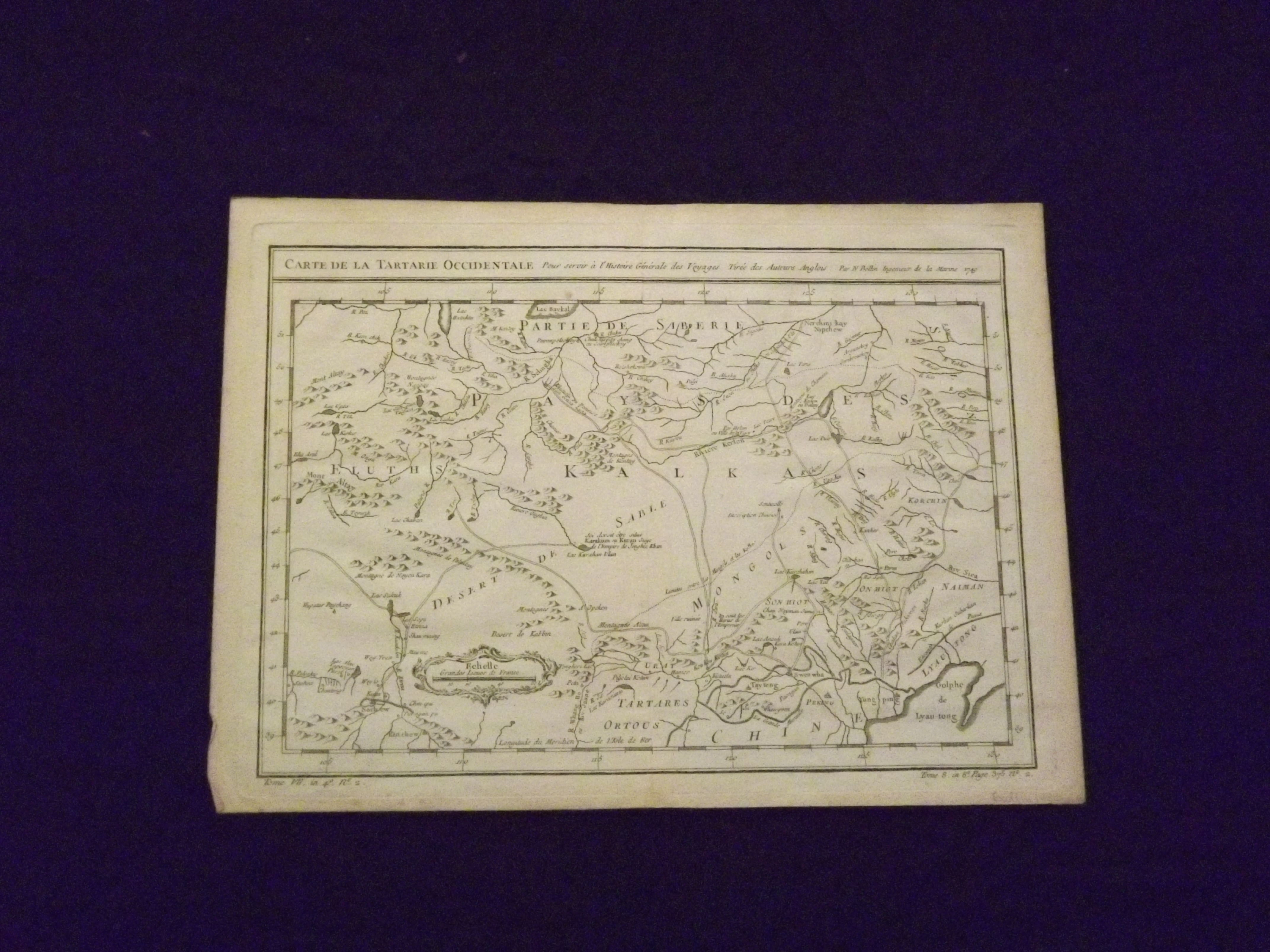 Small engraved map (9 1/2" x 12 1/2"), uncolored. Some aging and browning, a couple of minor chips and tears at one wide margin; otherwise very good. Bellin (1703-1772) was considered one of the most prominent cartographers of the 18th century in a career that lasted about 50 years. This map was first published around 1750, and shows part of Siberia and China, including part of the Great Wall and Peking. # 102337