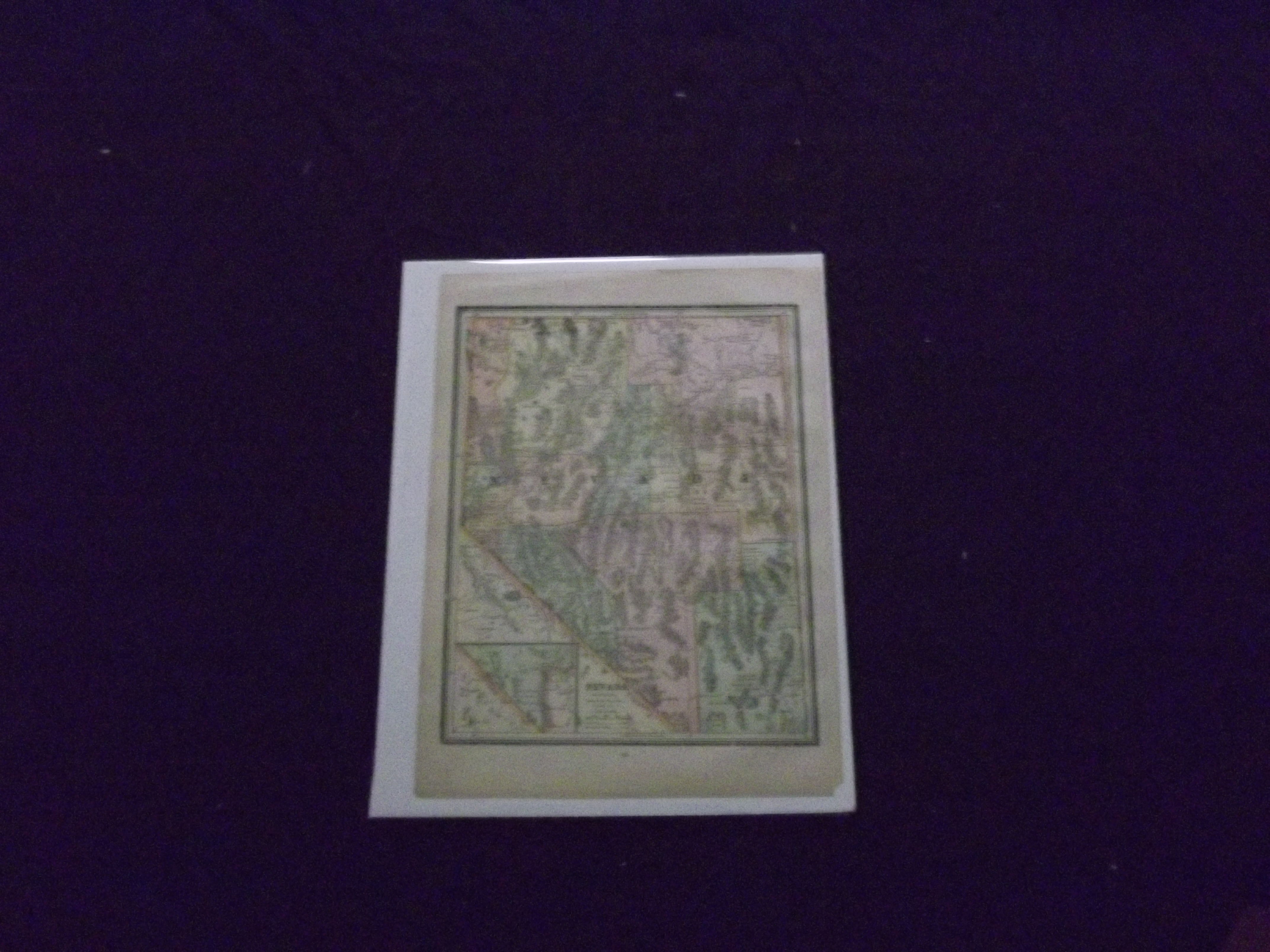 Single page map of Nevada (10 1/2" x 14") colored, ample margins. Paper slightly brittle, small chip in one corner, some normal aging and browning; overall very good or better. George F. Cram (1842-1928) served in the army during the Civil War, and founded his map company in Illinois in 1867, long after most of the major map companies established their business. Despite being wiped out by the Chicago fire in 1871, the company rebuilt and survived and started making globes in 1932, and continued as a business for over 130 years. Colorful map of Nevada, illustrating the California border, Carson City, Indian reserve in the southeast, and the Ralston Desert.