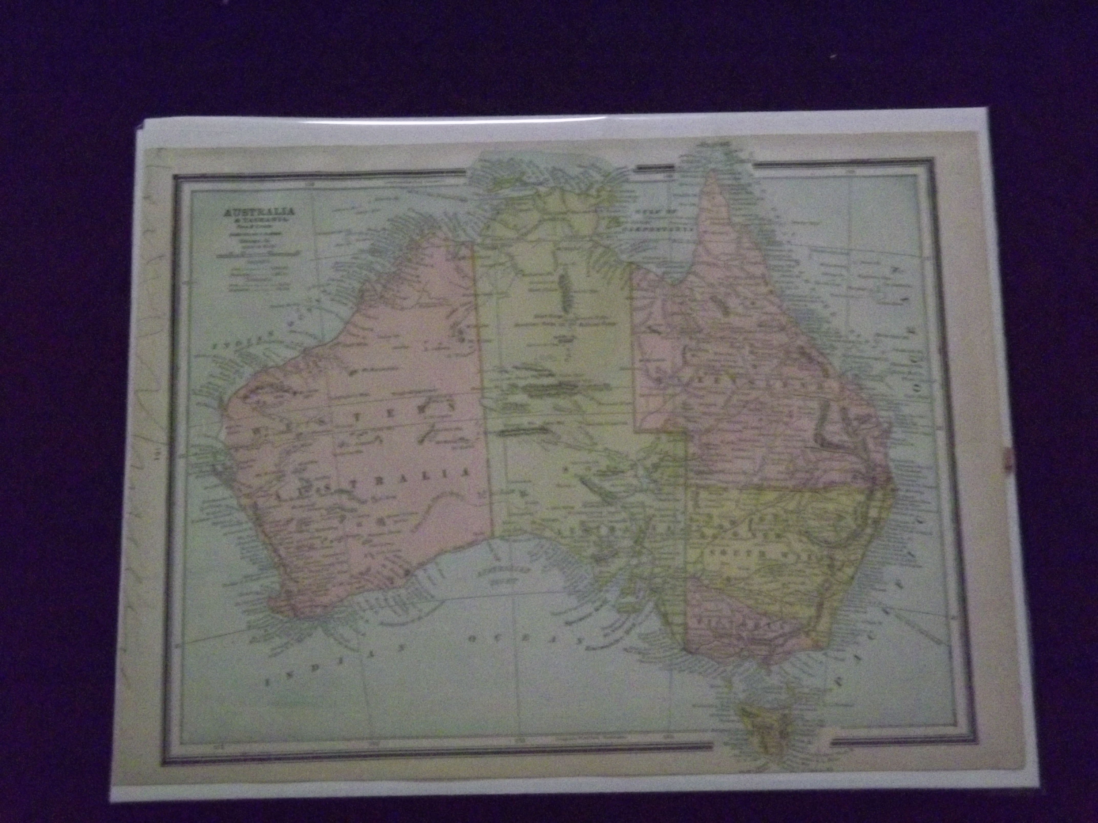 Single page map of mostly Australia (10 1/2" x 14"), colored. Paper slightly brittle, left margin has pencil marks, some normal aging and browning; otherwise about very good. George F. Cram (1842-1928) served in the army during the Civil War, and founded his map company in Illinois in 1867; long after most of the major map companies established their business. and started making globes in 1932, and continued as a business for over 130 years. Attractive and colorful map of Australia. Tasmania is illustrated in a small portion at the bottom of the map.