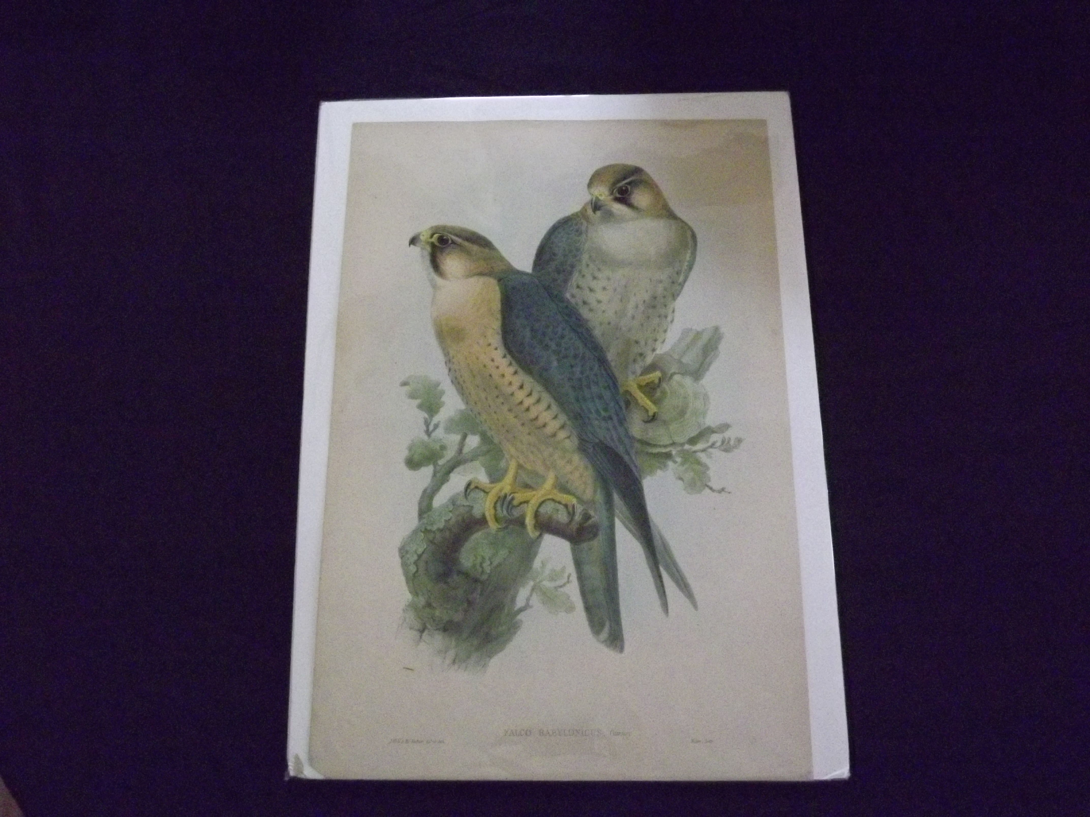 Folio (14" x 21"), colored lithographed bird plate. Small chip in lower left corner, some even browning and aging; still bright and colorful. John Gould (1804-1881) was born in Dorset, and spent his early career years as a taxidermist. By the late 1820s he entered the publishing business, and privately published his first publication that included folio sized bird plates (A Century of Birds Hitherto Unfigured from the Himalaya Mountains). The work appeared in twenty monthly installments. This work launched a fifty-year career that would pretty much use the same format for his future publications. This plate is probably plate number four from The Birds of Asia. ODB. Gould's Works on Natural History: Index.