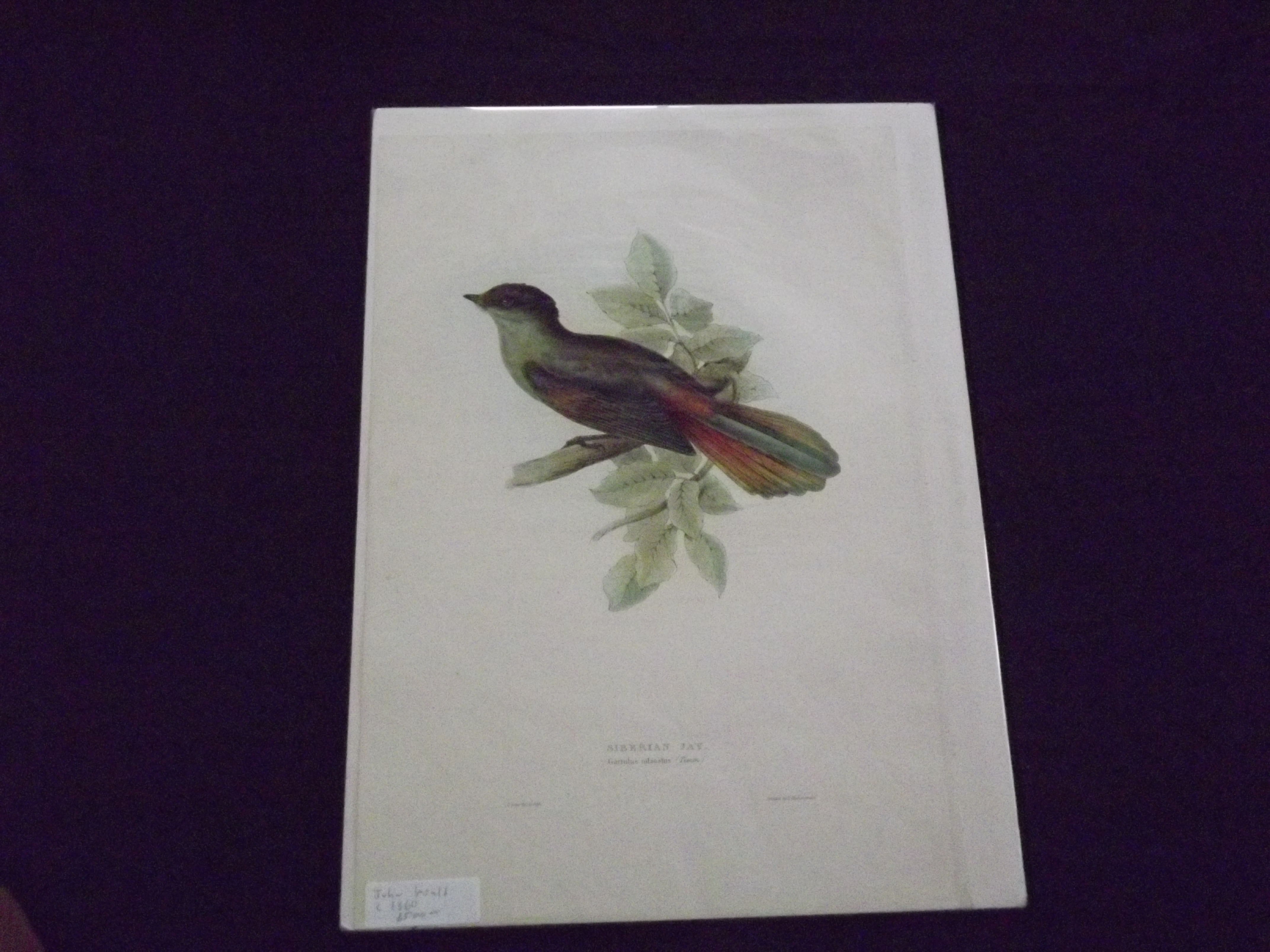 Folio (14" x 21"), colored lithographed bird plate. Small chips and tears in right margins; overall bright and colorful. John Gould (1804-1881) was born in Dorset, and spent his early career years as a taxidermist. By the late 1820s he entered the publishing business, and privately published his first publication that included folio sized bird plates (A Century of Birds Hitherto Unfigured from the Himalaya Mountains). The work appeared in twenty monthly installments. This work launched a fifty year career that would pretty much use the same format for his future publications. This plate is probably plate number 215 from the Birds of Europe. ODB. Gould's Works on Natural History: Index.