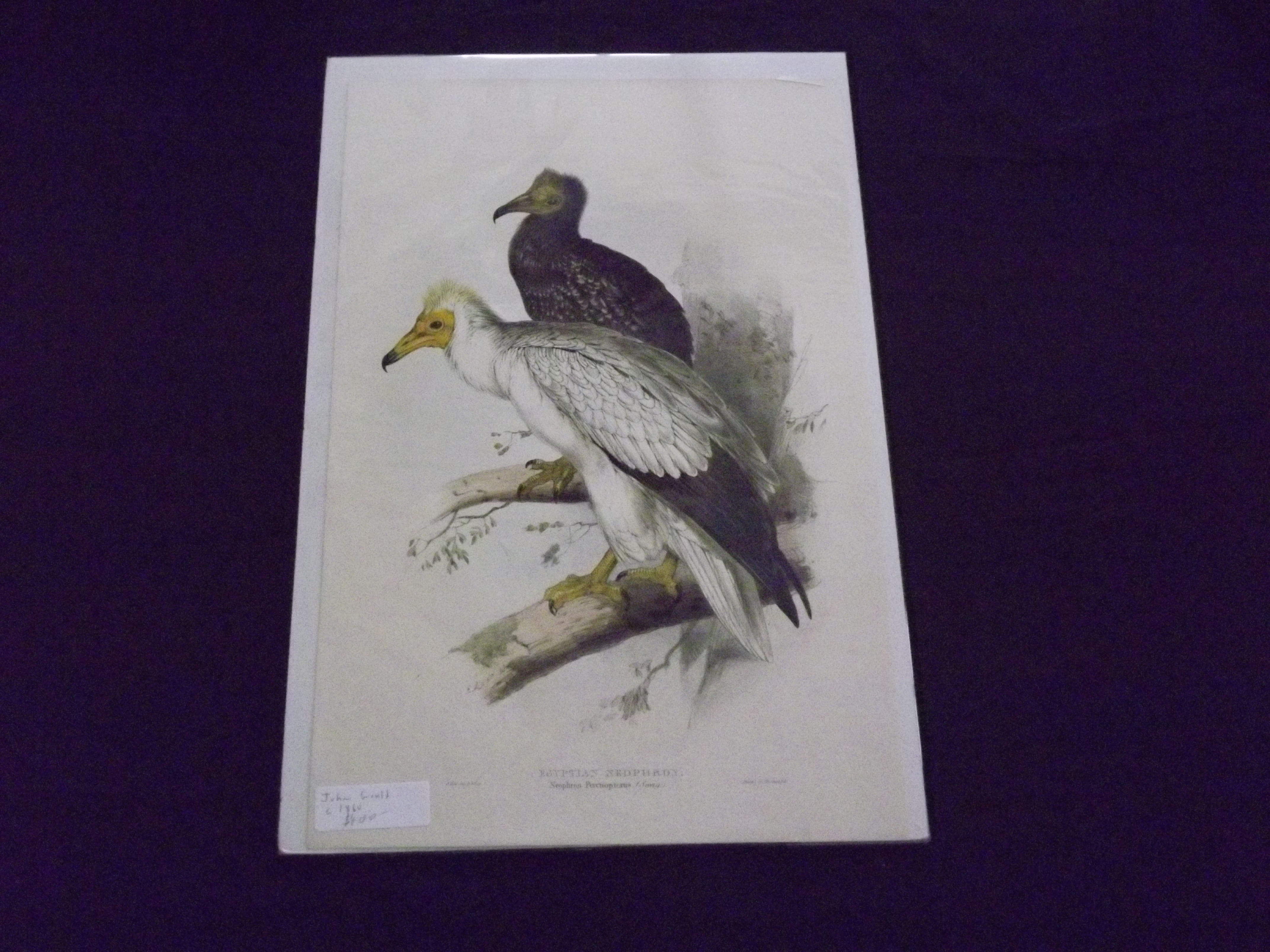 Folio (14" x 21"), colored lithographed bird plate. Slight toning; overall bright and colorful. John Gould (1804-1881) was born in Dorset, and spent his early career years as a taxidermist. By the late 1820s he entered the publishing business, and privately published his first publication that included folio sized bird plates (A Century of Birds Hitherto Unfigured from the Himalaya Mountains). The work appeared in twenty monthly installments. This work launched a fifty-year career that would pretty much use the same format for his future publications. This plate is probably plate number three from the Birds of Europe. ODB. Gould's Works on Natural History: Index.