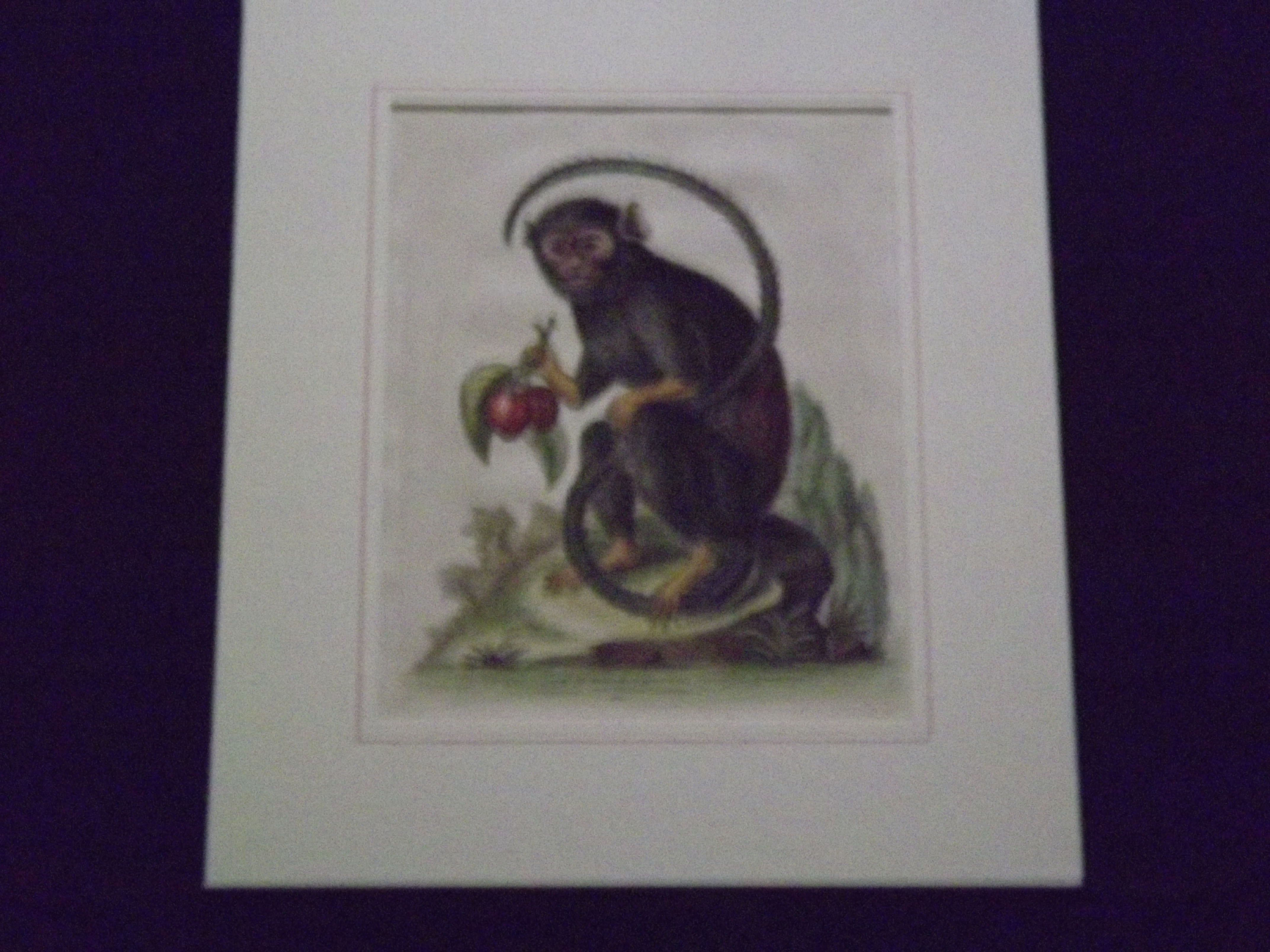 Copper engraved plate, colored, 9" x 11 1/2". Matted, hinged at the top, some even toning and aging; otherwise in very good condition, with a clean and bright impression. George Edwards (1694-1773) was born in Essex, and was apprenticed as a child to a merchant in London. He preferred a more artistic career, and eventually set up his own studio. The naturalist and artist Mark Catesby taught him how to etch, and this led to publishing four volumes of his hand colored engravings with related text under the title A Natural History of Uncommon Birds. The first volume came out in 1743, and the final volume was published in 1751. This plate shows a small black monkey holding some fruit. According to the notation on the illustration the image was supposed to represent actual size. ODB.