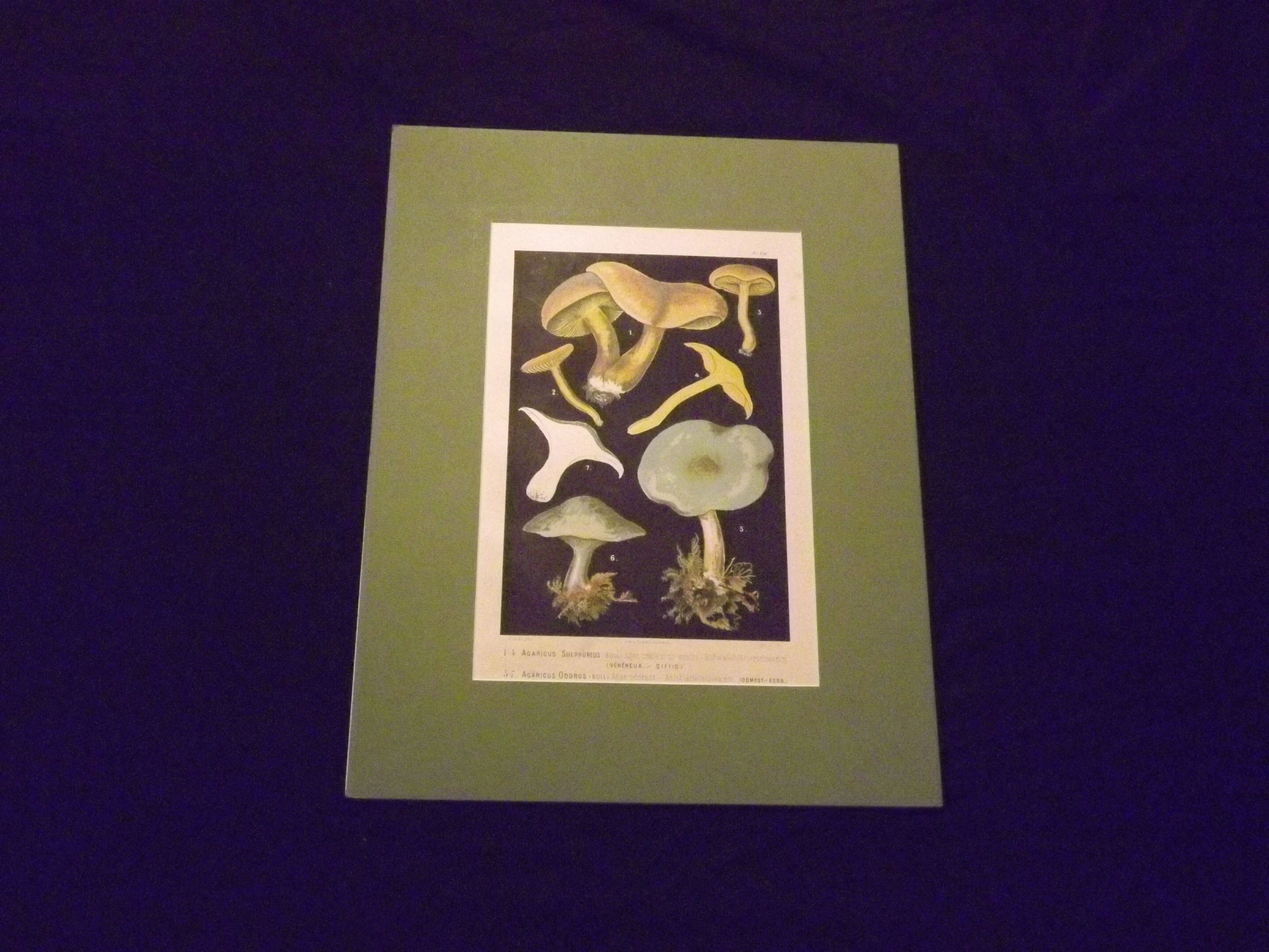 Folio (13 1/2" x 10"), chromolithograph, archivally matted, attached at top margin. A little toning and browning, left margin a little rough at the edge; otherwise bright and clean. Attractive and colorful chromolithograph of mushrooms from Leuba's Les Champignons Comestibles. This is plate number XIV, and it shows seven different mushrooms.