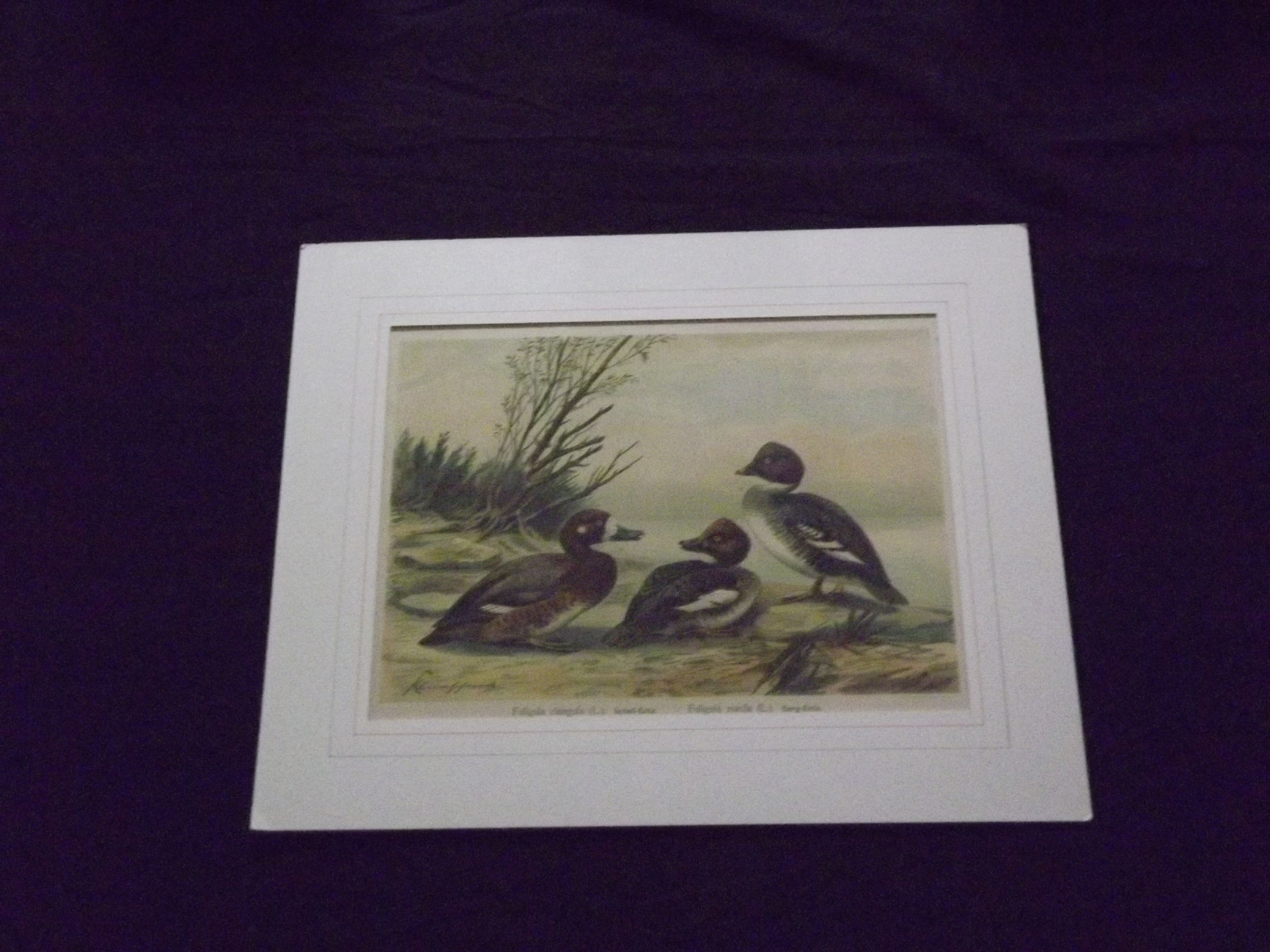 Folio (11" x 15") chromolithograph, colored, archivally matted, attached at top margin, ample margins. Some aging and browning; otherwise bright and clean and very colorful. This very attractive chromolithograph of three ducks is taken from Johann Andreas Naumann's (1747-1846) work on European birds. This illustration shows the ducks against a natural background. May require extra shipping. Ripley and Scribner page 205. Zimmer 453-461.