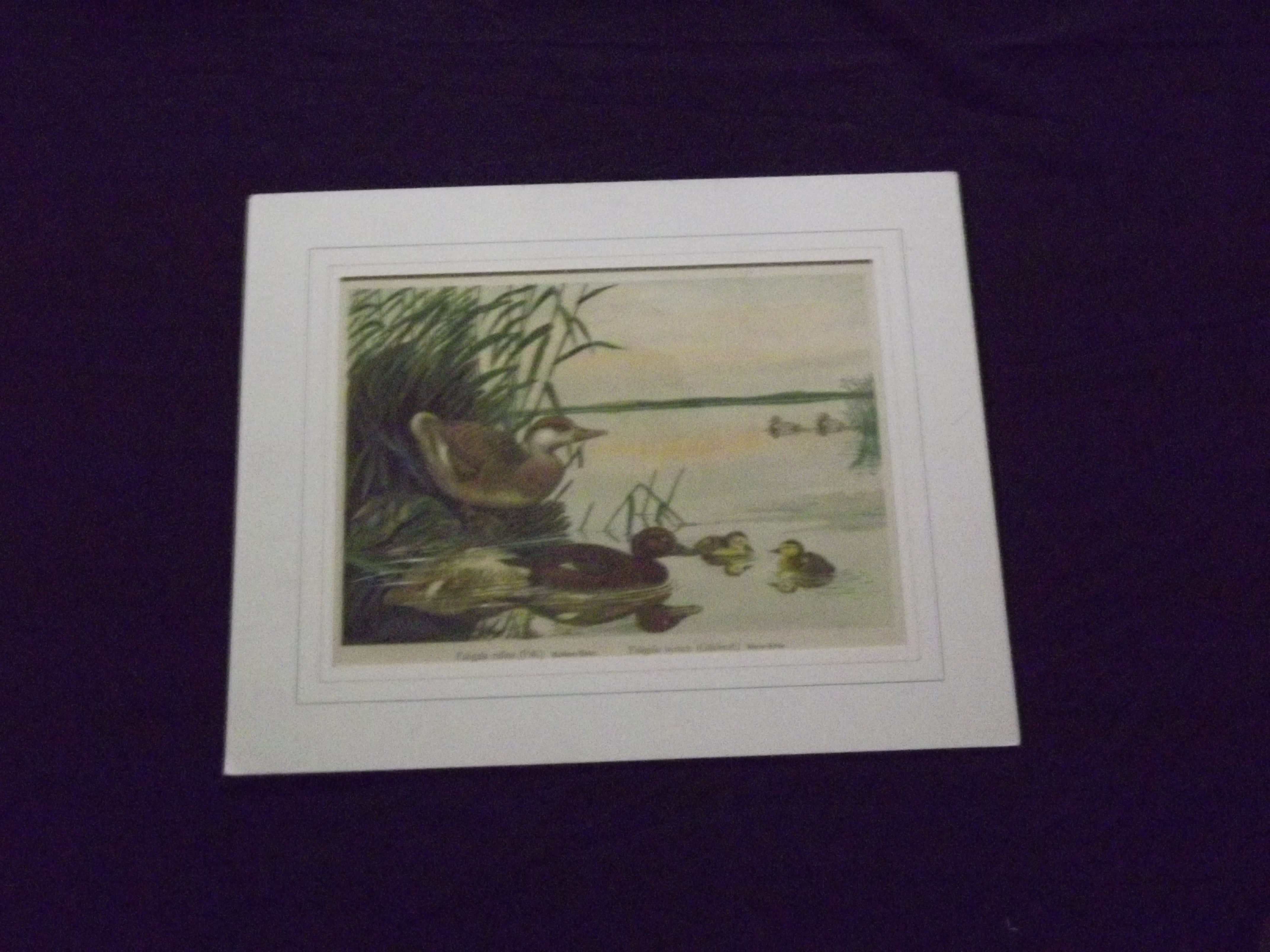 Folio (11" x 15") chromolithograph, colored, archivally matted, attached at top margin, ample margins. Some aging and browning, small ink line on right margin of mat; otherwise bright and clean and very colorful. This very attractive chromolithograph of two ducks is taken from Johann Andreas Naumann's (1747-1846) work on European birds. This illustration shows a few ducks against a natural background with their offspring. May require extra shipping. Ripley and Scribner page 205. Zimmer 453-461.