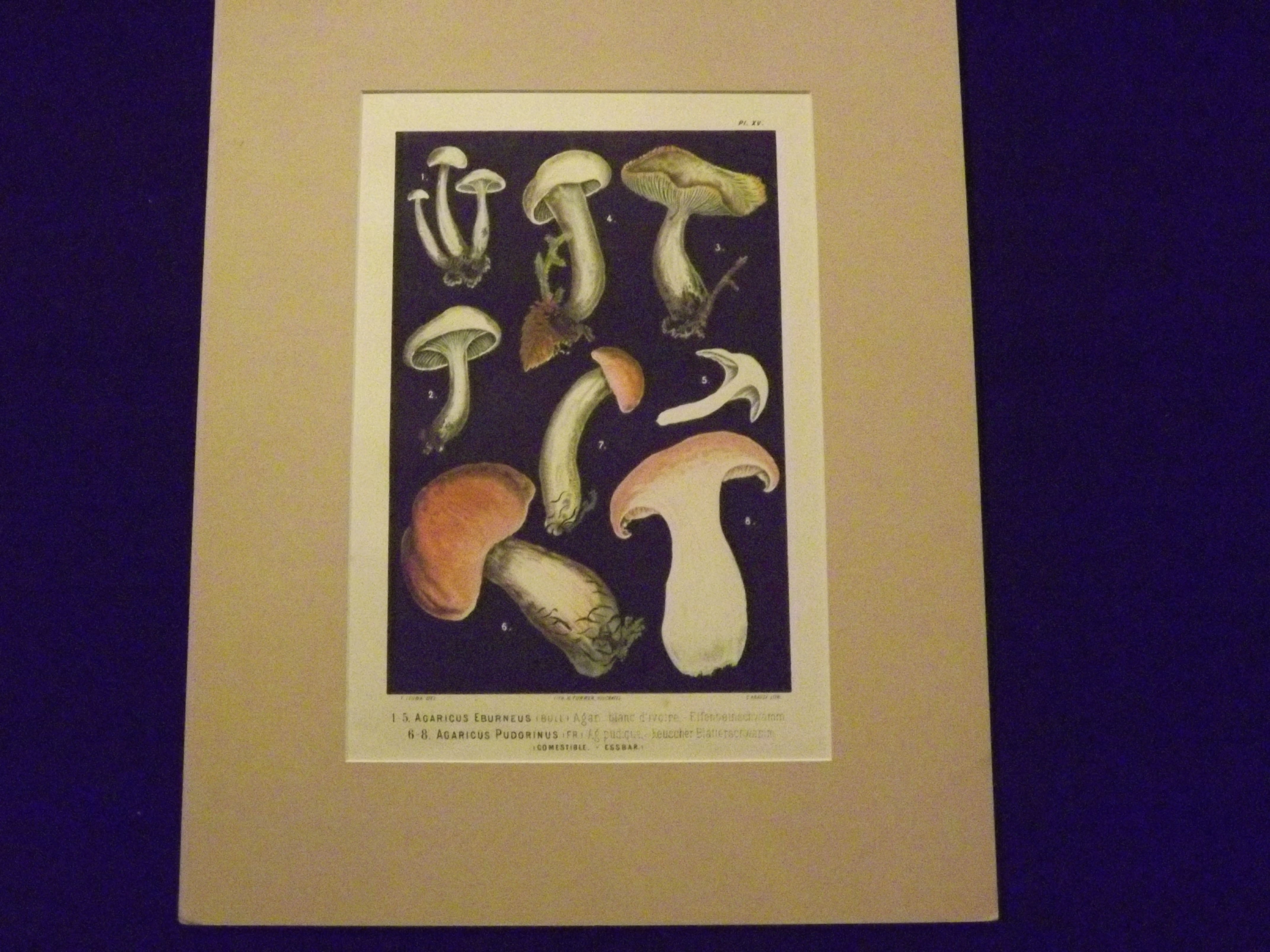 Folio (13 1/2" x 10"), chromolithograph, archivally matted, attached at top margin. A little toning and browning, left margin a little rough at the edge; otherwise bright and clean. Attractive and colorful chromolithograph of mushrooms from Leuba's Les Champignons Comestibles. This is plate number XV, and it shows four different mushrooms.