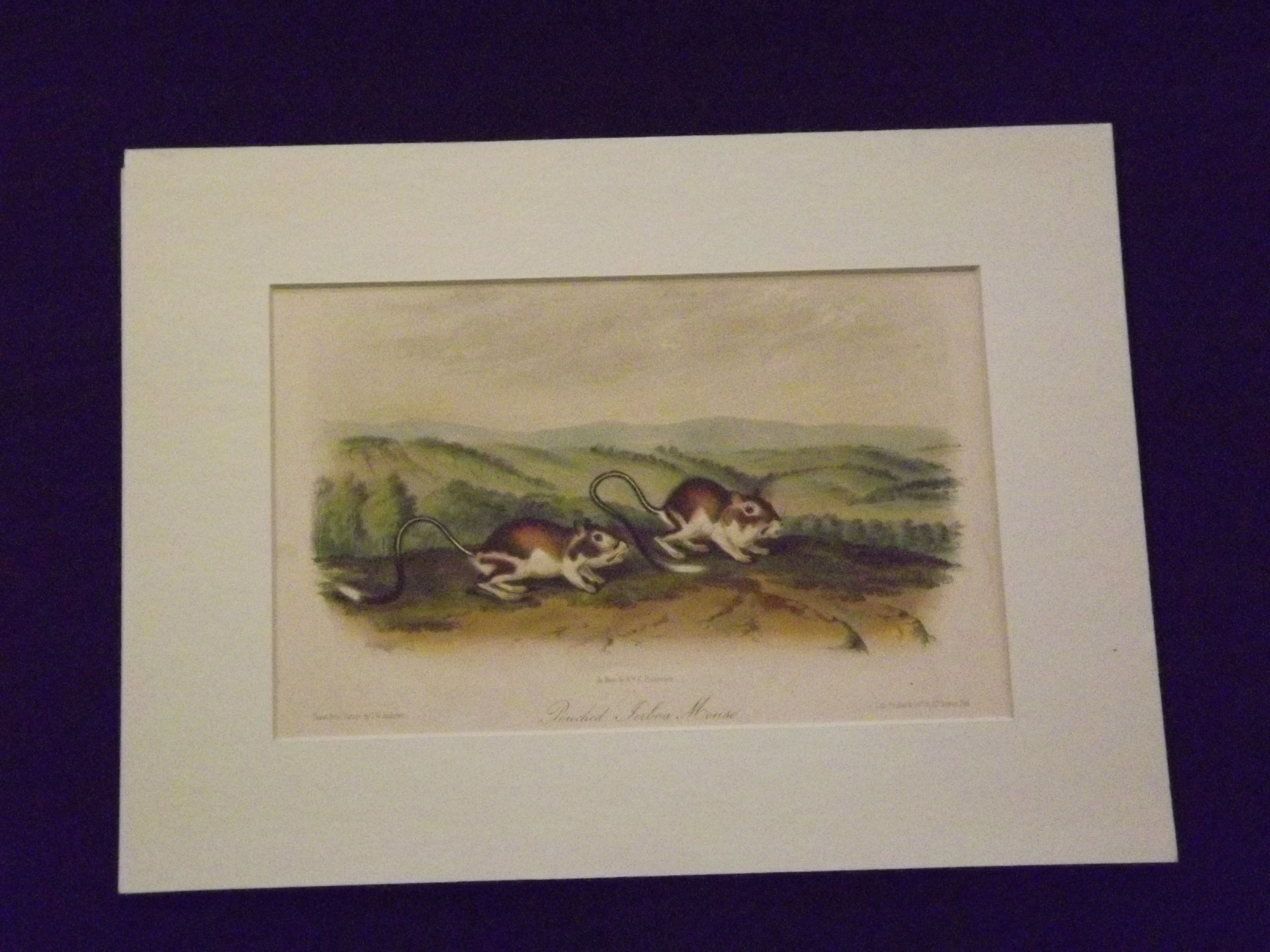 Print, 8vo, color lithograph, plate CXXX, matted, but not laid down. Upper margin a little rough, some aging and browning, slight foxing; otherwise very good. John James Audubon (1765-1851), after coming to America around 1803 would become a noted naturalist and artist. His most well known work, The Birds of America, was produced between 1826-1838 and sold by subscription. The folio edition of The Viviparous Quadrupeds of North America, was also sold by subscription, and published from 1845-1848. The octavo size version of this work was first published from 1849-1854. This plate of the Pouched Jerboa Mouse, which shows a pair against a natural background, is generally clean and bright and was from a set published by J.T. Bowen. ANB. Audoboninfo website.