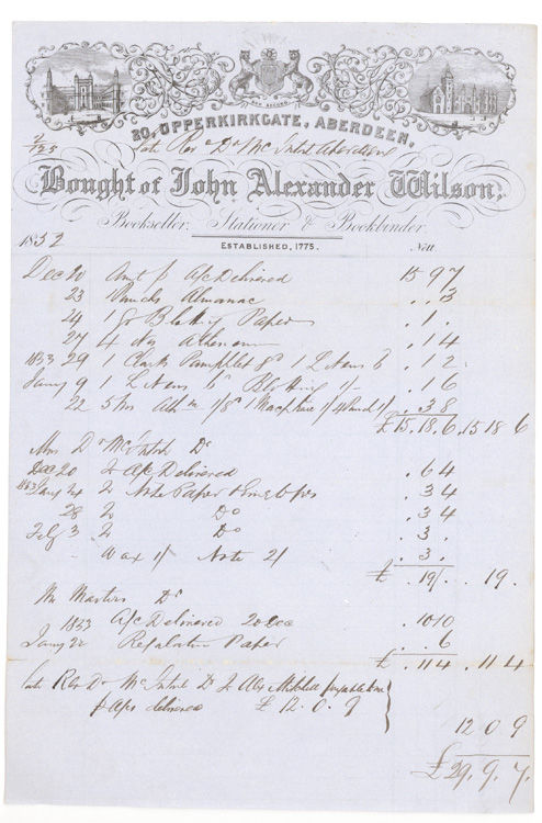 Billhead of John Alexander Wilson Bookseller, Stationer & Bookbinder. Bill for £29.9.7 for almanacs, blank paper, etc.