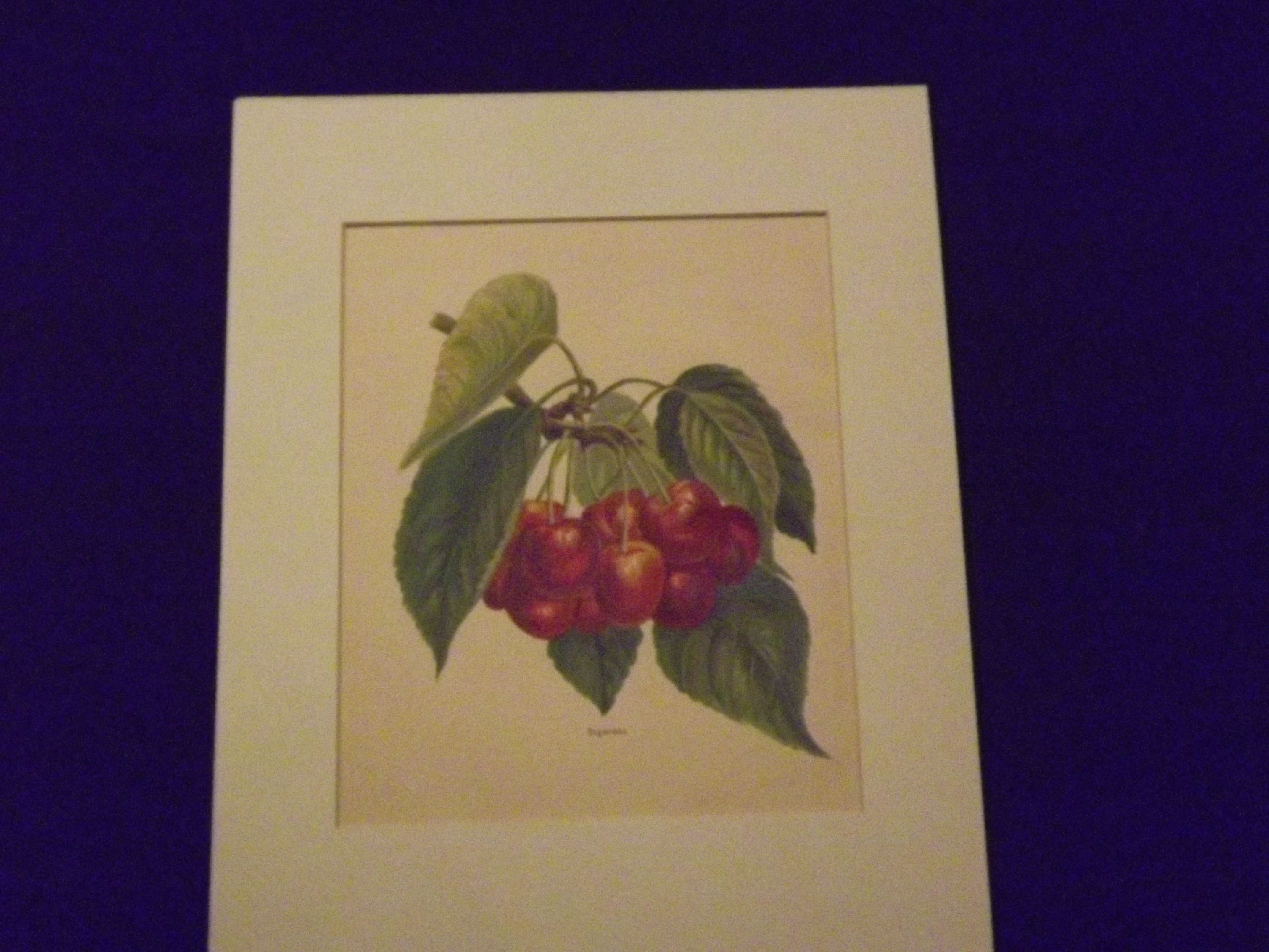 Print, 4to, chromolithograph, colored, matted attached to backing board at the top. Slight aging and browning; otherwise bright and clean. This plate comes from Wright's (1836-1916) celebrated work on fruit (The Fruit Growers Guide). The beautiful plates from this work are credited to Miss Gertrude Hamilton and Marie Low. This chromolithograph features a group of cherries, surrounded by green leaves. This plate is extremely colorful and life like.