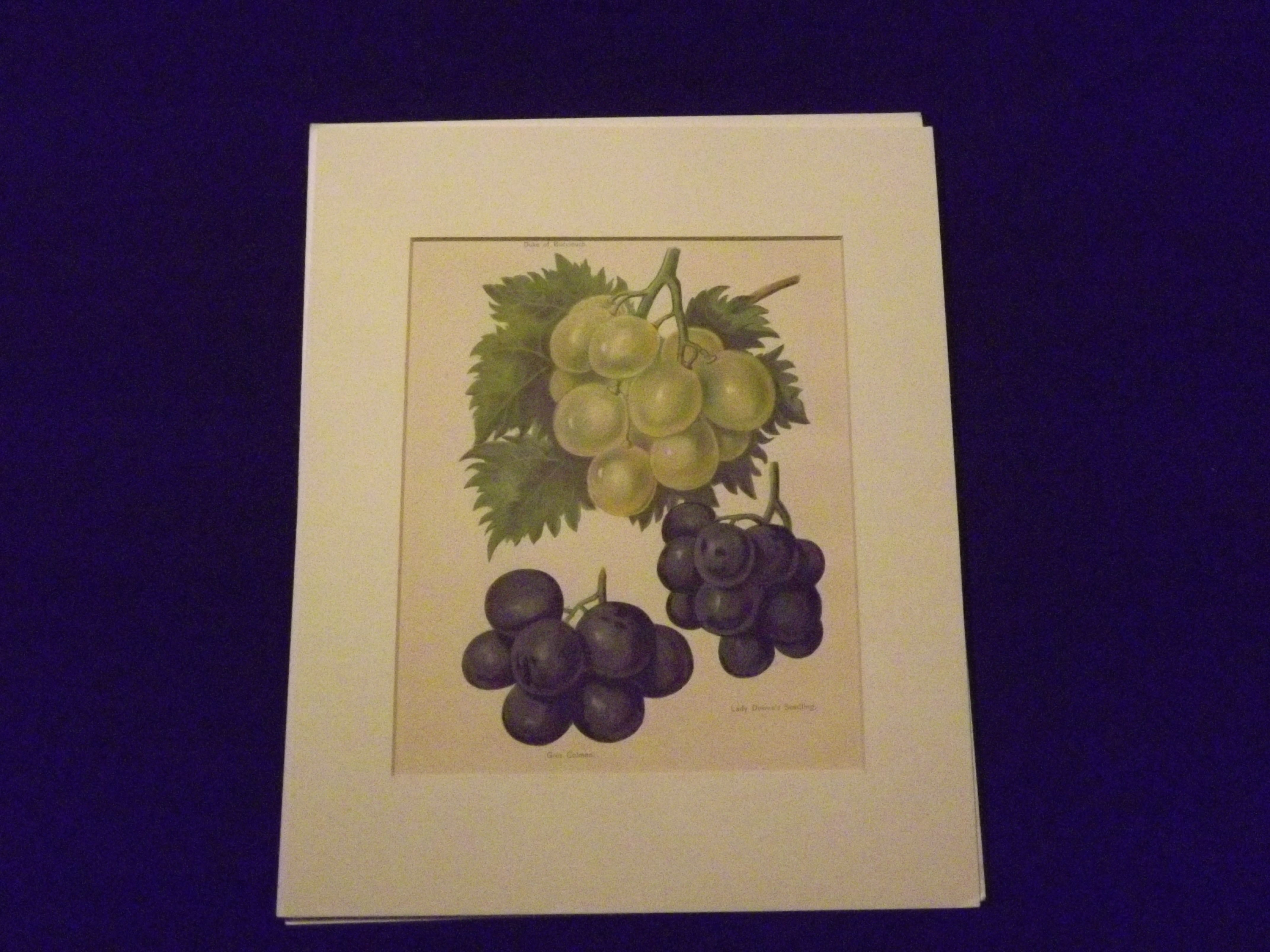 Print, 4to, chromolithograph, colored, matted attached to backing board at the top. Slight aging and browning, right margin a little rough and dark at the edge; otherwise bright and clean. This plate comes from Wright's (1836-1916) celebrated work on fruit (The Fruit Growers Guide). The beautiful plates from this work are credited to Miss Gertrude Hamilton and Marie Low. This chromolithograph features a group of grapes with some green leaves. This plate is extremely colorful and life like.