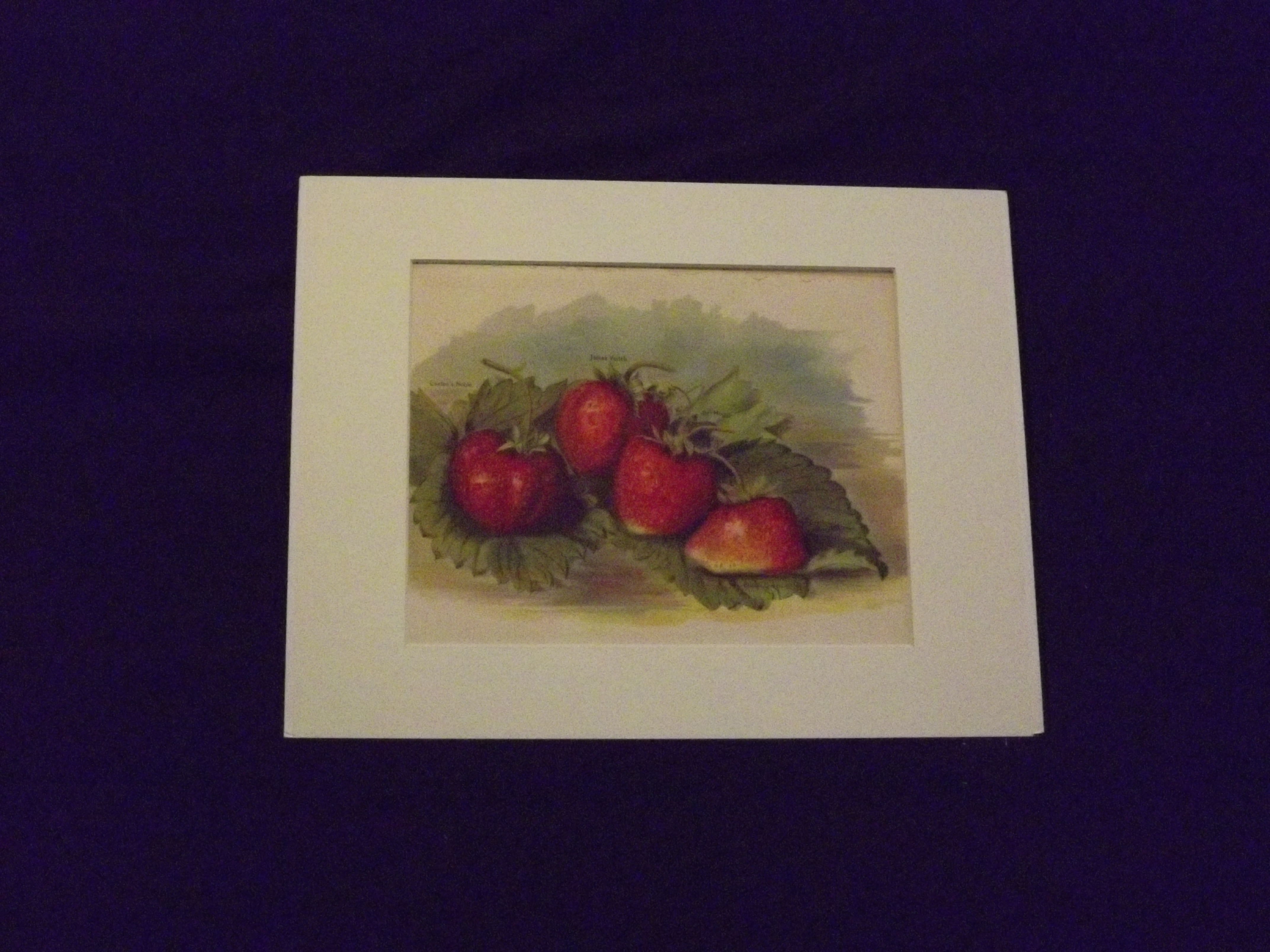 Print, 4to, chromolithograph, colored, matted attached to backing board at the top with two small pieces of archival tape. Some aging and browning, top margin a little rough; otherwise very good. This plate comes from Wright's (1836-1916) celebrated work on fruit (The Fruit Growers Guide). The beautiful plates from this work are credited to Miss Gertrude Hamilton and Marie Low. This chromolithograph features two types of strawberries with some green leaves.