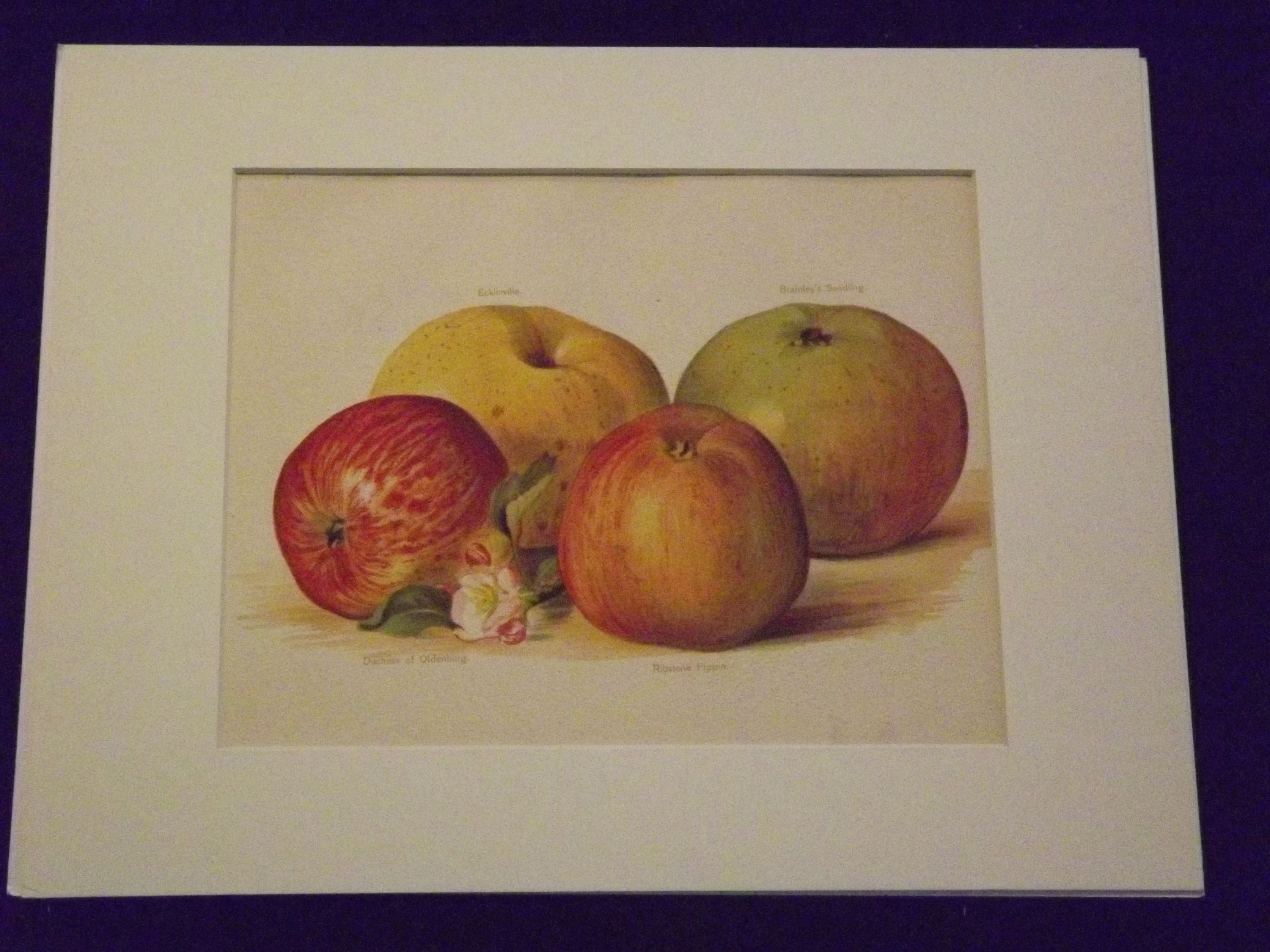 Print, 4to, chromolithograph, colored, matted attached to backing board at the top with two small pieces of archival tape. Some aging and browning; otherwise bright and clean. This plate comes from Wright's (1836-1916) celebrated work on fruit (The Fruit Growers Guide). The beautiful plates from this work are credited to Miss Gertrude Hamilton and Marie Low. This chromolithograph features four types of apples, Duchess of Oldenburg, Ribstone Pippin, Ecklinville, and Bramley's Seedling. This plate is extremely colorful and bright.